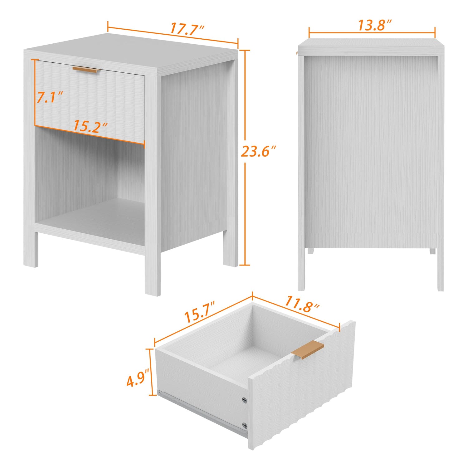 - ✅【Stylish Nightstand】- Overall dimensions: 17.71"W x 13.80" D x 23.62"H. Our nightstand provides ample storage space for all your bedside essentials. From books and reading glasses to electronic devices and personal items, everything can find its place within this spacious night stand. With its roomy desktop, fashion drawer, and open compartment, our bedside table allows you to keep your belongings tidy and within reach.