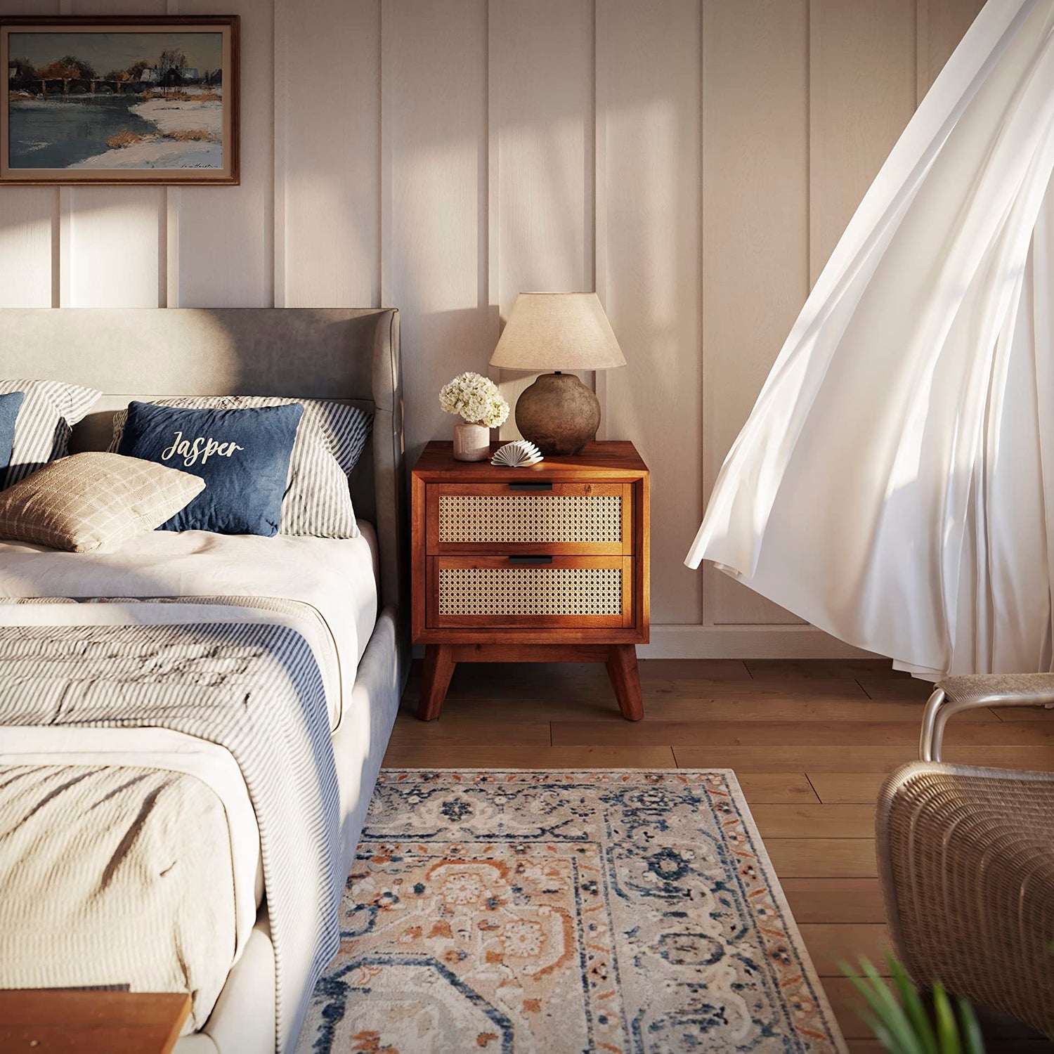 - MULTIFUNCTIONAL SOLID WOOD BOHO SIDE TABLE: Our mid century side table is both fashionable and functional; The rattan side table can meet your storage needs with its spacious tabletop; Two rattan drawers of the bed side table have a wide storage space