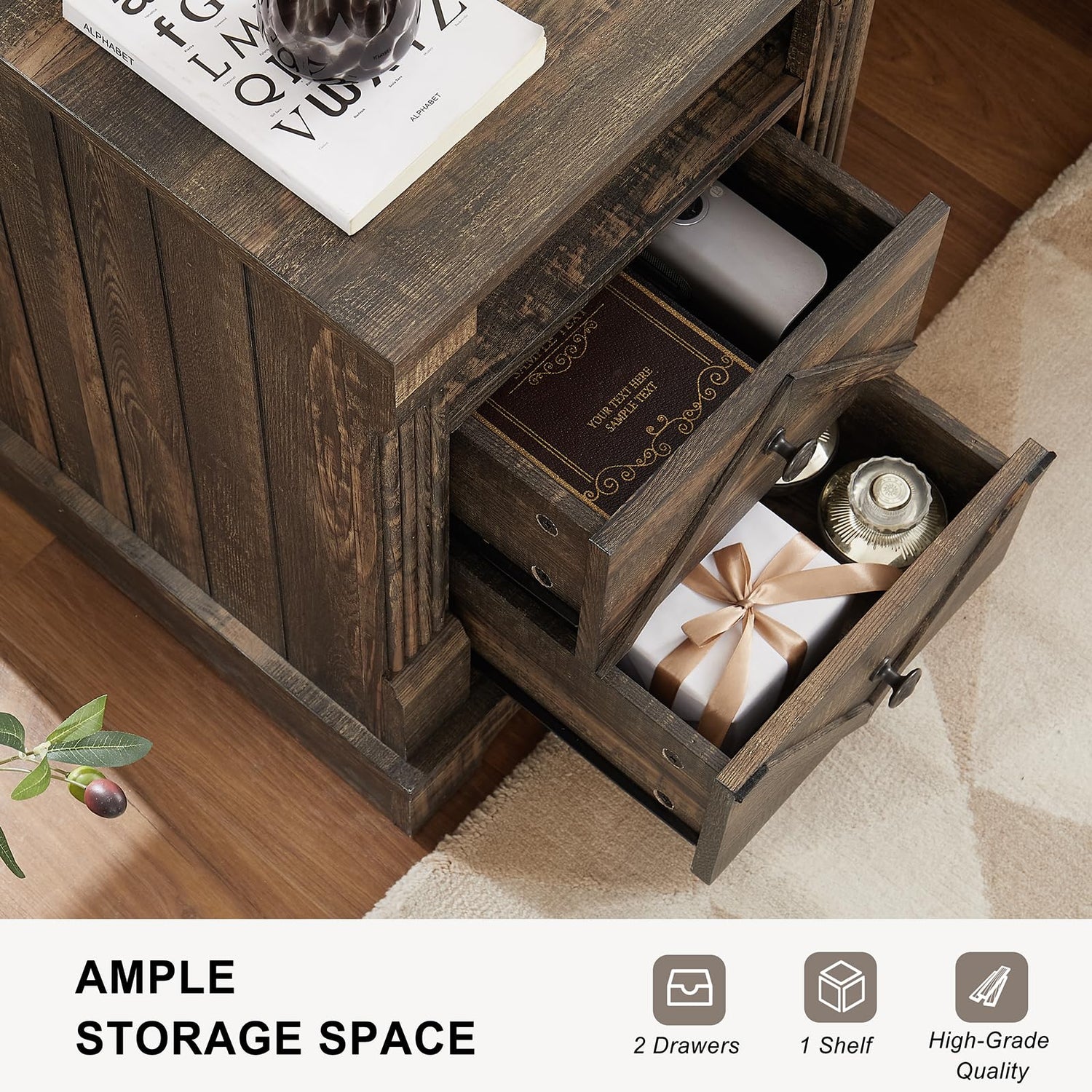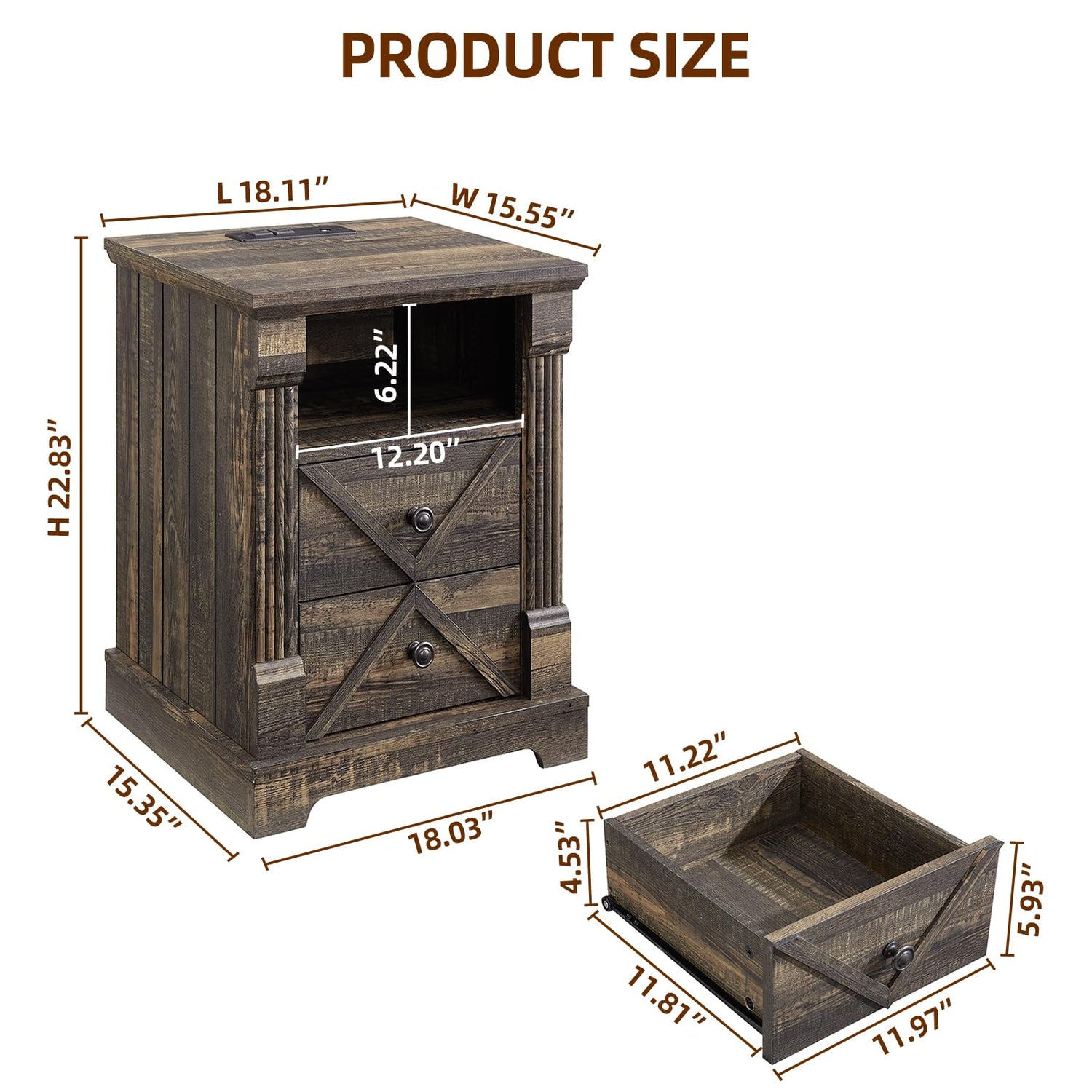 BuildHom Farmhouse Nightstand with Charging Station, 18" Modern Wood Side Table, 2 Drawers End Table & Roman Column Design for Living Room, Bedside Table with Open Shelf for Bed Room, Dark Rustic Oak