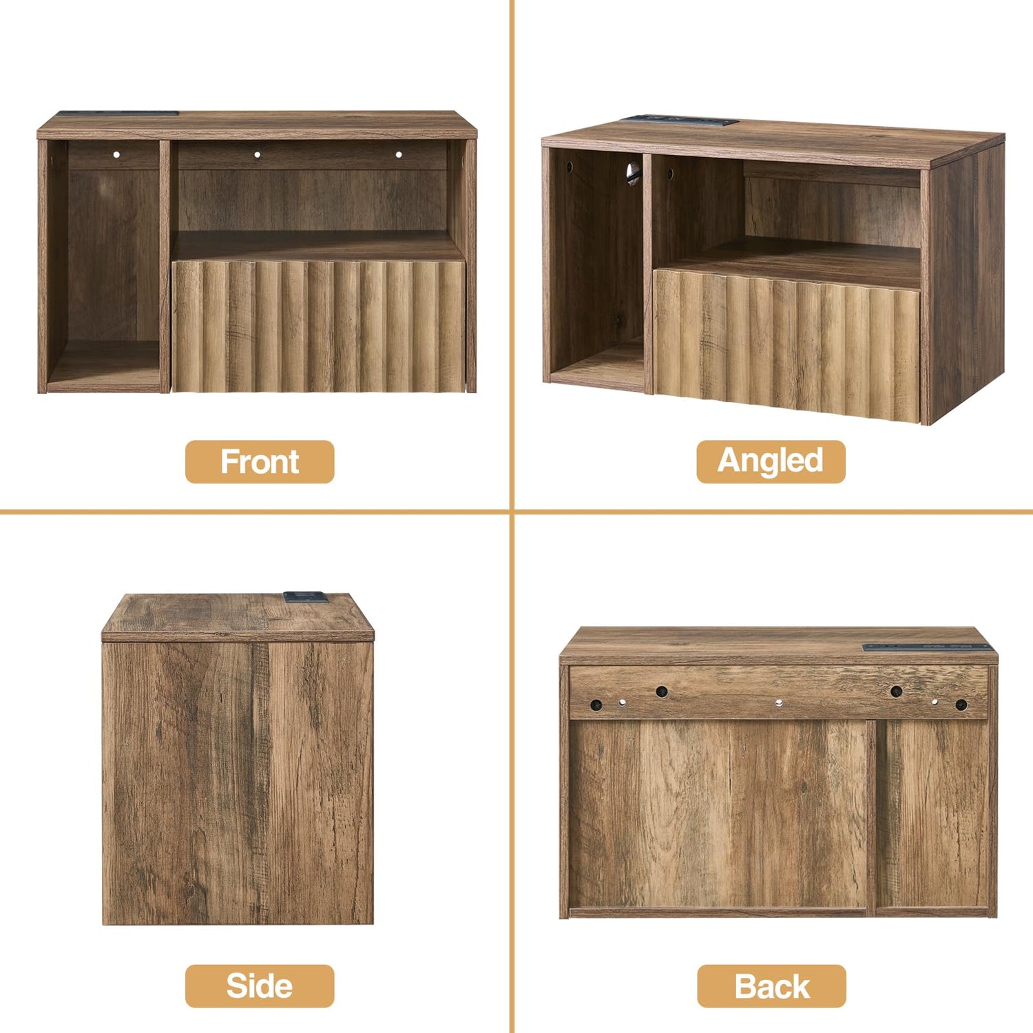 BuildHom Floating Nightstand with Charging Station - Modern Rustic Brown Fluted Bedside Table with Drawer, USB Ports & Outlets (Set of 2)