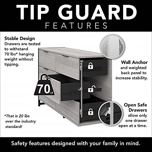 Details: Add a touch of modern industrial style to your bedroom with the kathy ireland® Home by Bush Furniture Atria 6 Drawer Dresser. Designed with your safety in mind, all six drawers have been rigorously tested with a 70 lb. weight to surpass industry standards for stability on both hard and carpeted flooring. The innovative Open-Safe mechanism takes stability a step further by preventing more than one drawer per side from pulling out at a time, and a wall anchor is included with the 57W x 17D x 34H horizontal dresser to provide even more security. The Dresser's drawers also feature smooth ball bearing slides that stop when fully extended to keep them from being removed unintentionally. Find the right look for your bedroom with Charcoal Gray, Platinum Gray and Modern Hickory finish options, all complemented by Black industrial metal framework. Atria's modern furniture collection also includes a Small Nightstand with Drawer and Shelves, Bedroom Mirror, and Full/Queen Size Headboard along with additional solutions for the home office and living room (coordinating items sold separately). This wide chest of drawers has been meticulously tested to meet or exceed industry standards for safety, durability and performance and is backed by the Bush Furniture 3 Year Manufacturer's Warranty. American made with U.S. and imported parts.