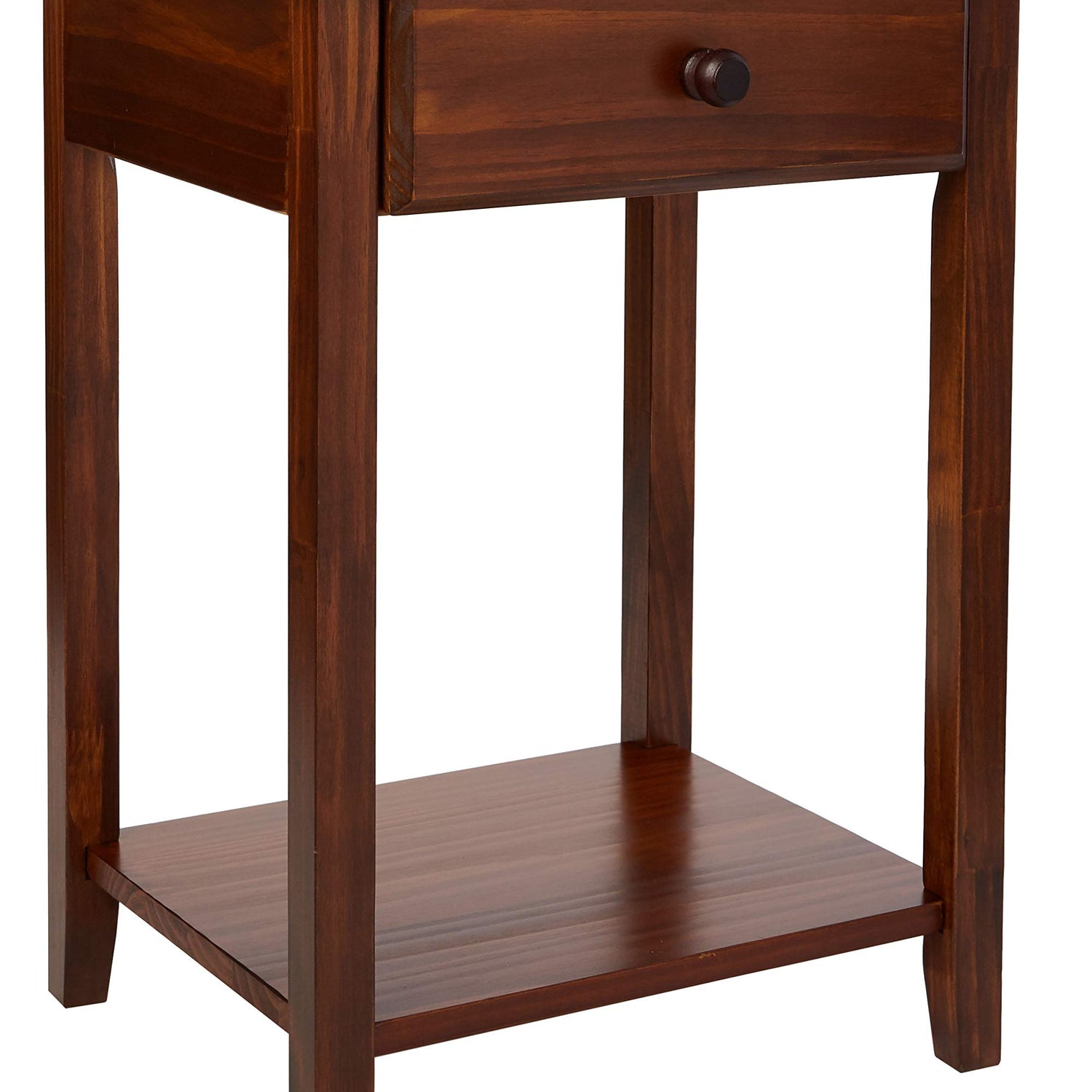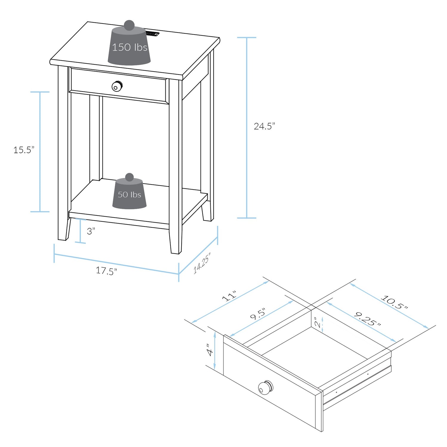 Details: The Night Owl Solid Wood Nightstand brings a cozy appeal to your bedroom or living room. Featuring a unique 4-Port USB Charging Station that allows easy access for charging cell phones, digital cameras, personal media players, and more at night. Open shelf and drawer provide ample space to store or deocrate. Tech-friendly features with classic style that you can count on.