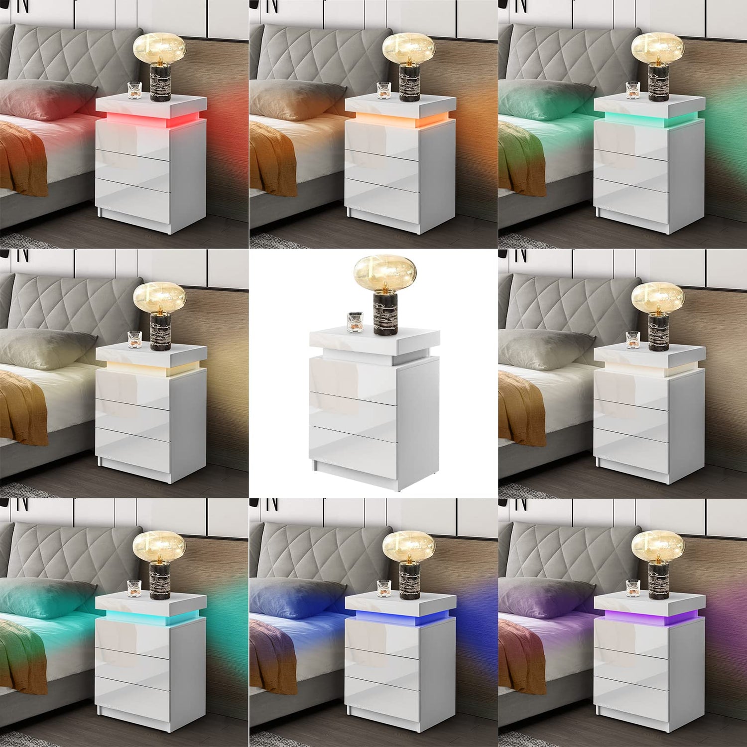 - 【LED Nightstand】Modern nightstand, the effect of LED lights can be changed by remote control. It has 4 kinds of lighting effects and 16 kinds of color changing lights for you to choose. The USB charging plug is common to all switches.
