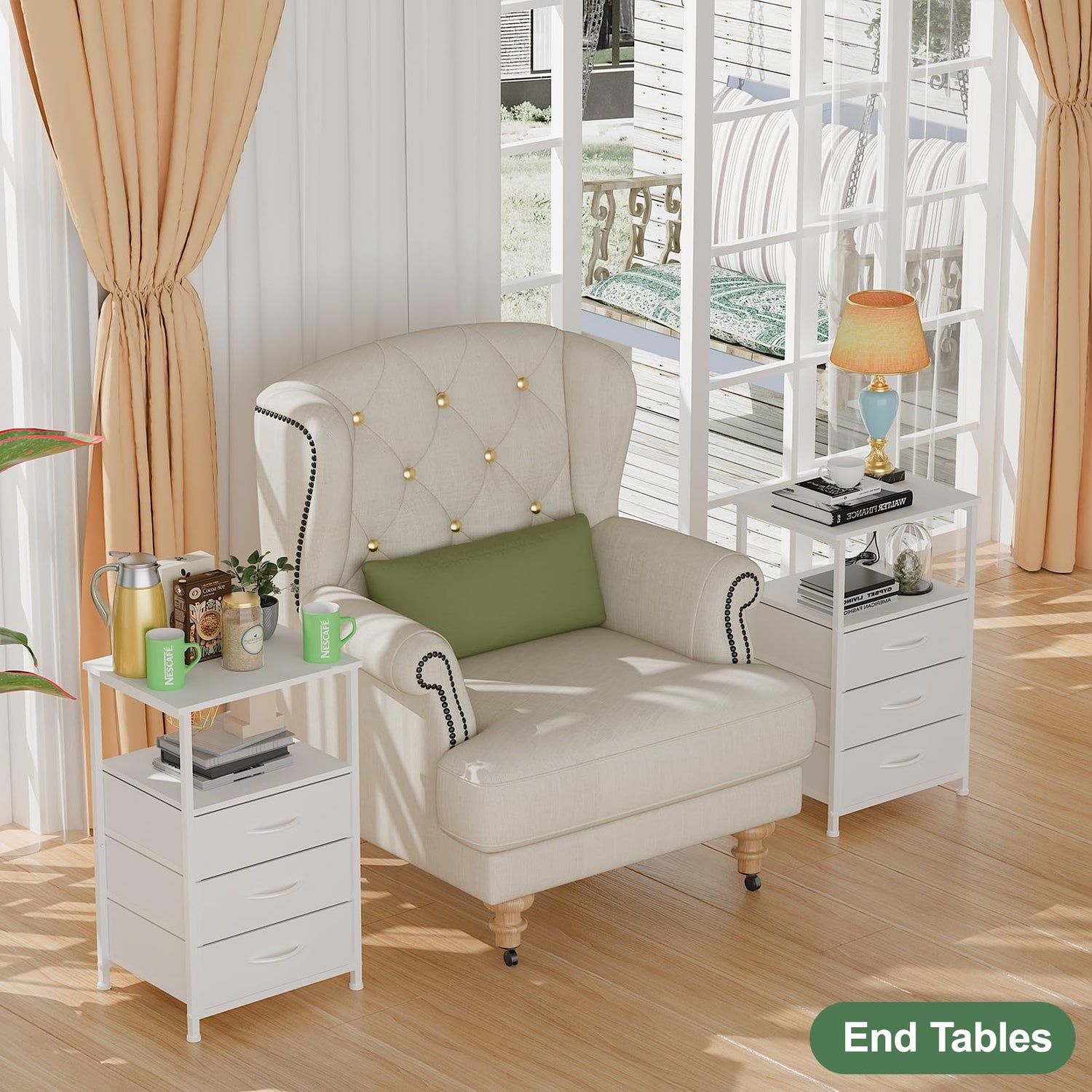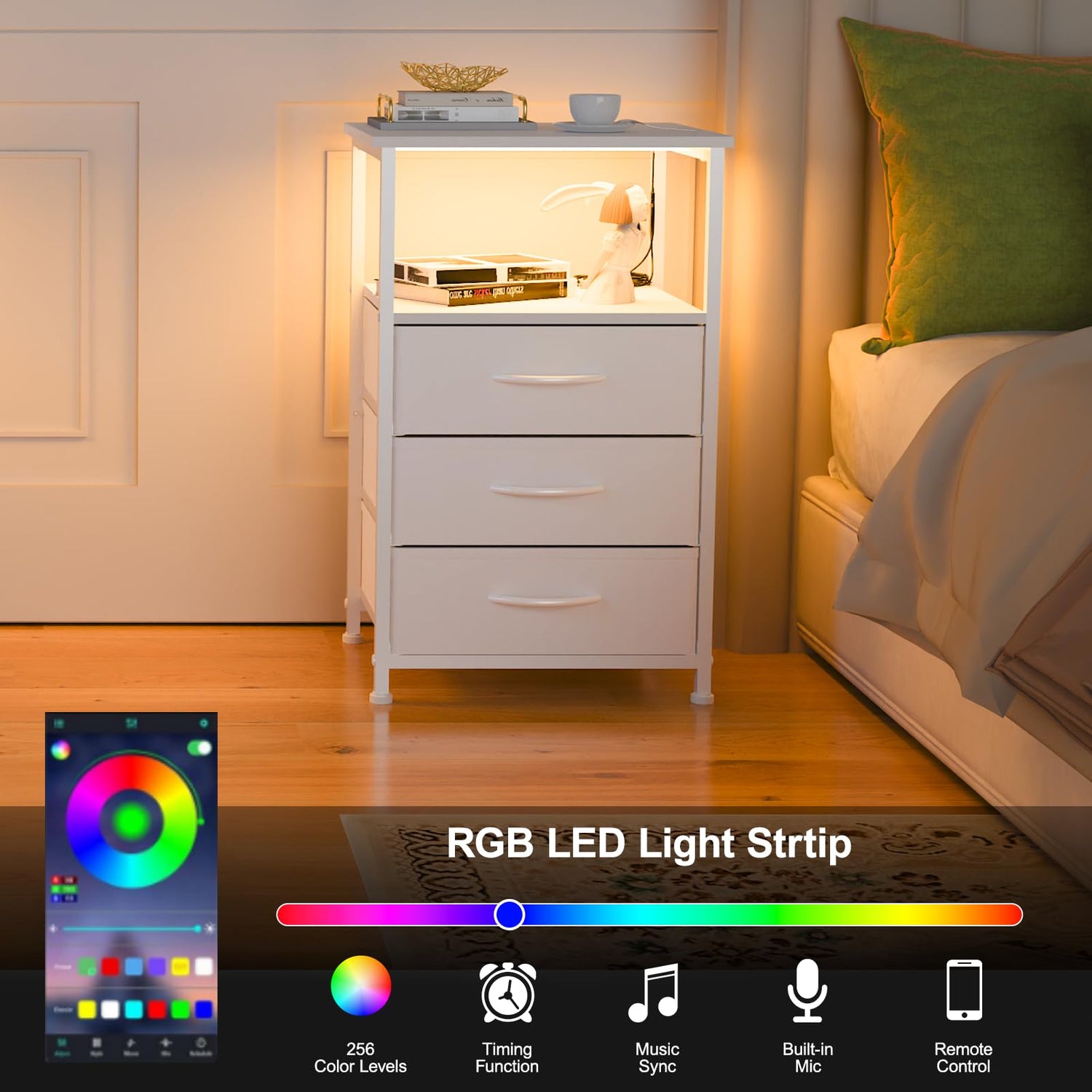 Dicasser Nightstand with Drawers,White NightStand with LED Light, Bedside Table with 3 Fabric Drawers for Bedroom, Modern Night Stand for Small Spaces,White