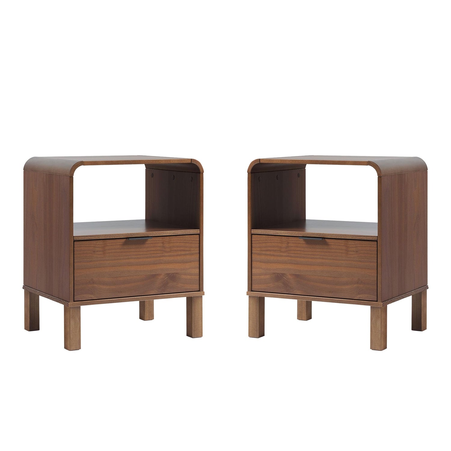 Details: Your new modern marvels have arrived. With their curved top and minimalist hardware, this trendy nightstand set serves both looks and functionality. A single cubby and drawer lend enough storage for your everyday essentials, and their versatile build means you can perch these pieces next to your couch or your bed. Their sustainably sourced solid pine wood build and painted or stained finish make them the durable pieces that are going to last through all each goodnight and every good morning at your bedside for as long as you need.