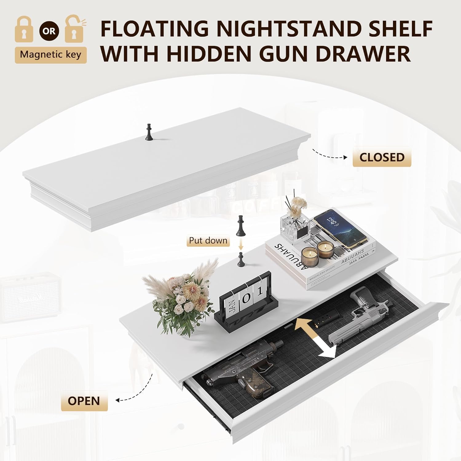Eylar Intact Secret Home Decor with Hidden Storage, Floating Night Stand with Gun Drawer, Space-Saving Gun Shelf for Bedroom, Hallway, Office, Solid Wood (White)