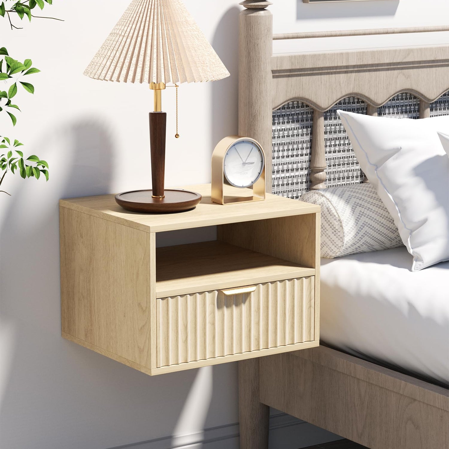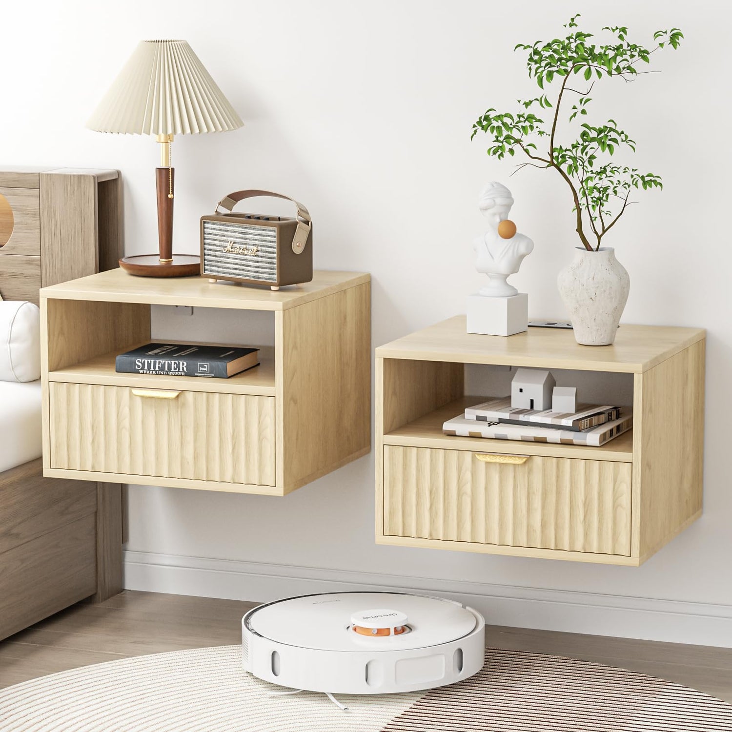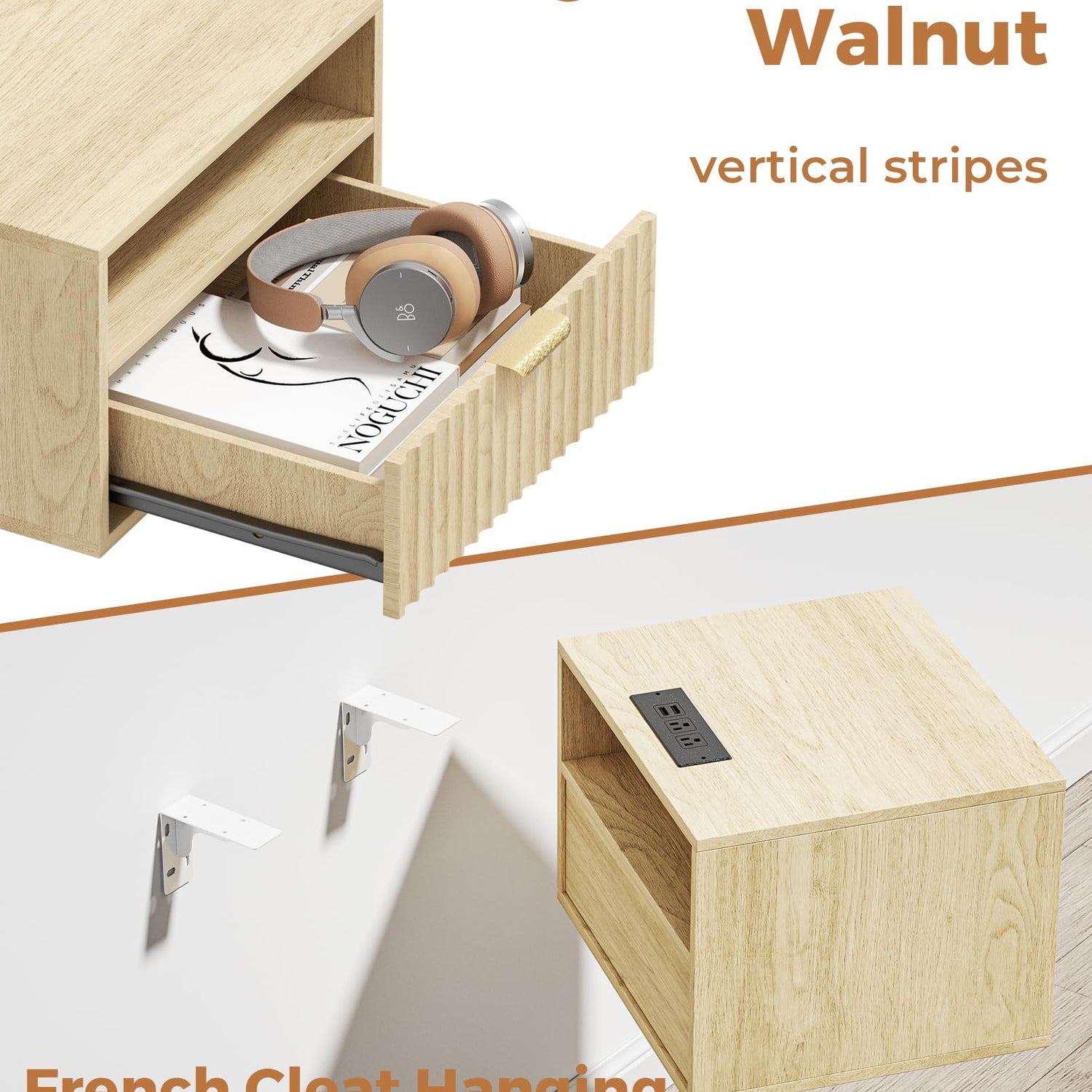 Floating Nightstand Set of 2 - Fluted Night Stand with Charging Station Wood Wall Mounted Nightstand with Drawer & Open Shelf, Modern Bedside Table Large End Table for Bedroom Closet