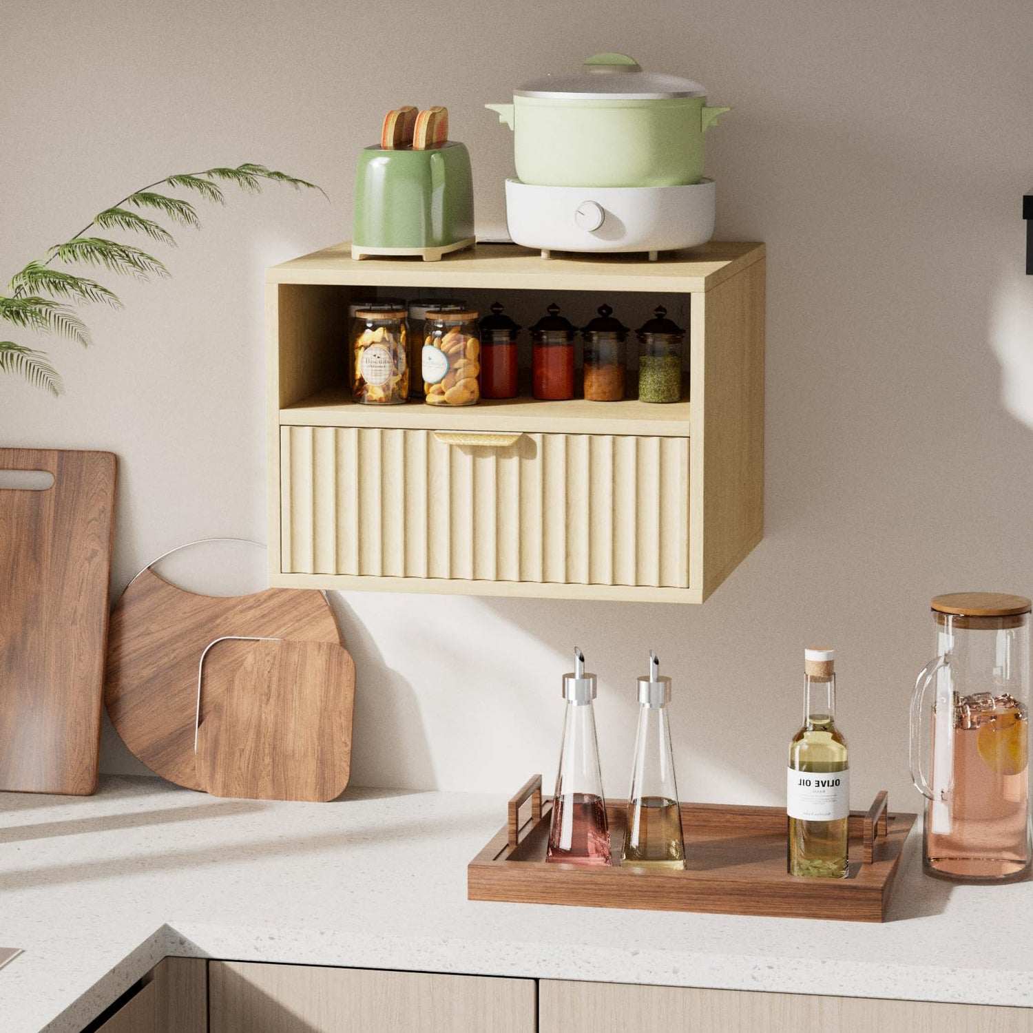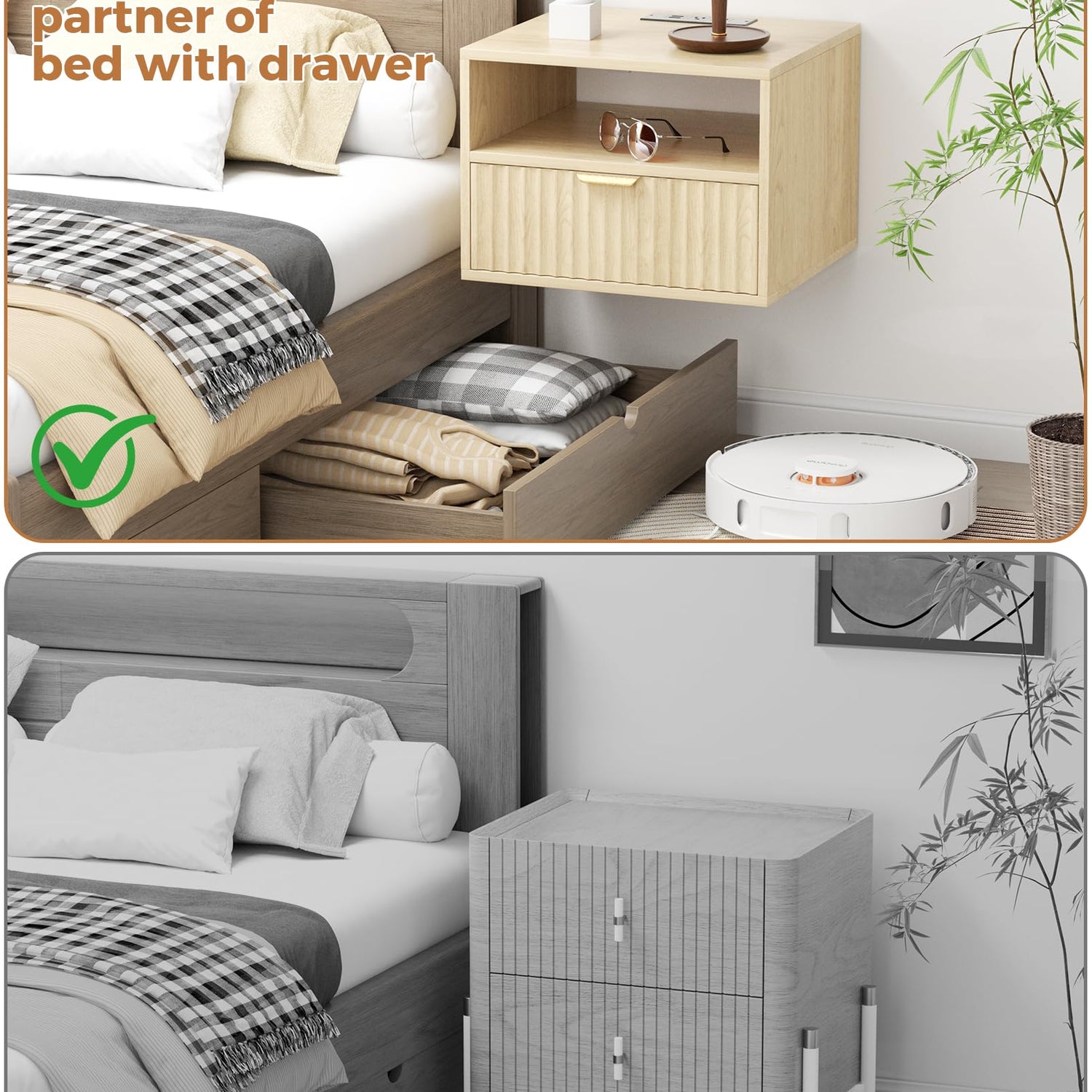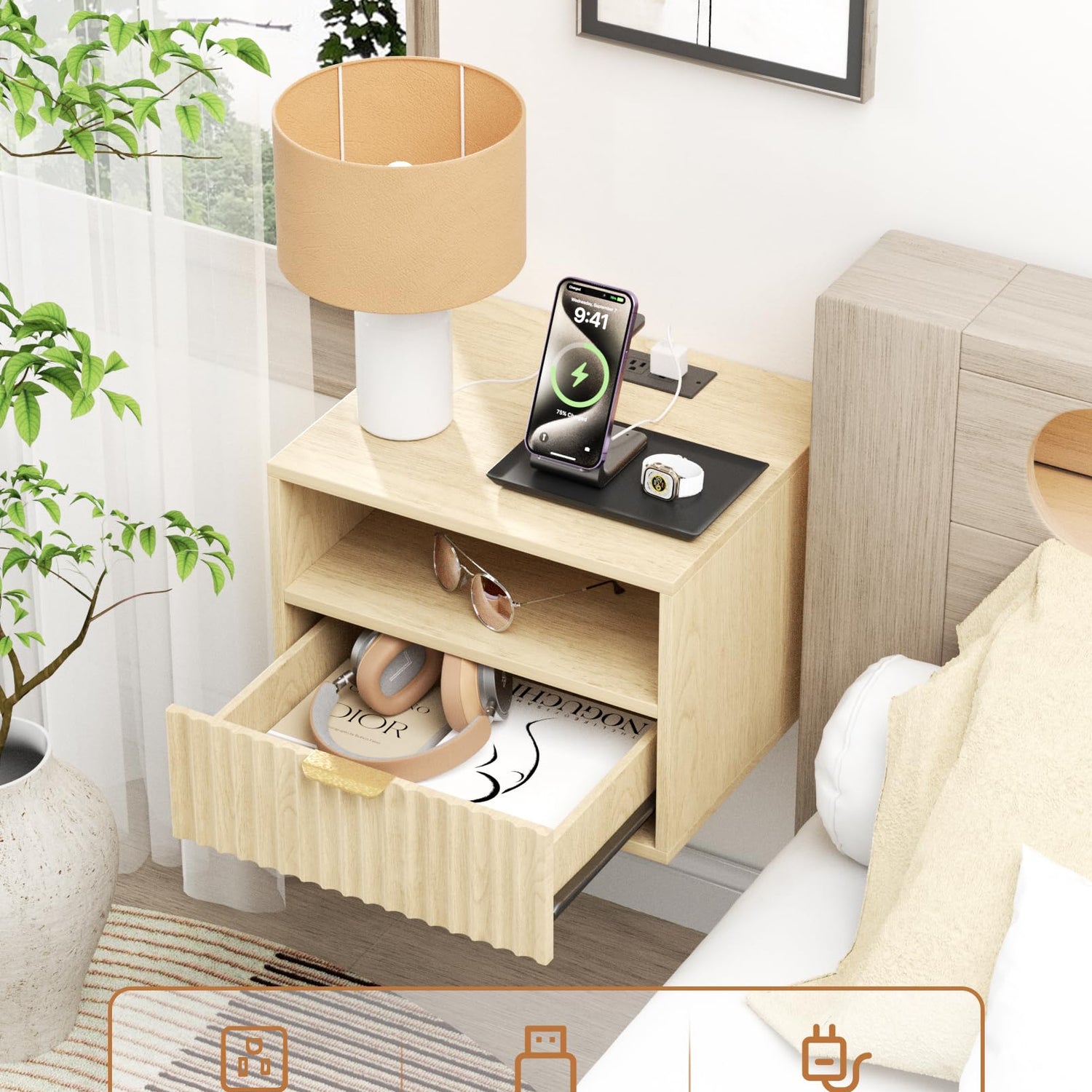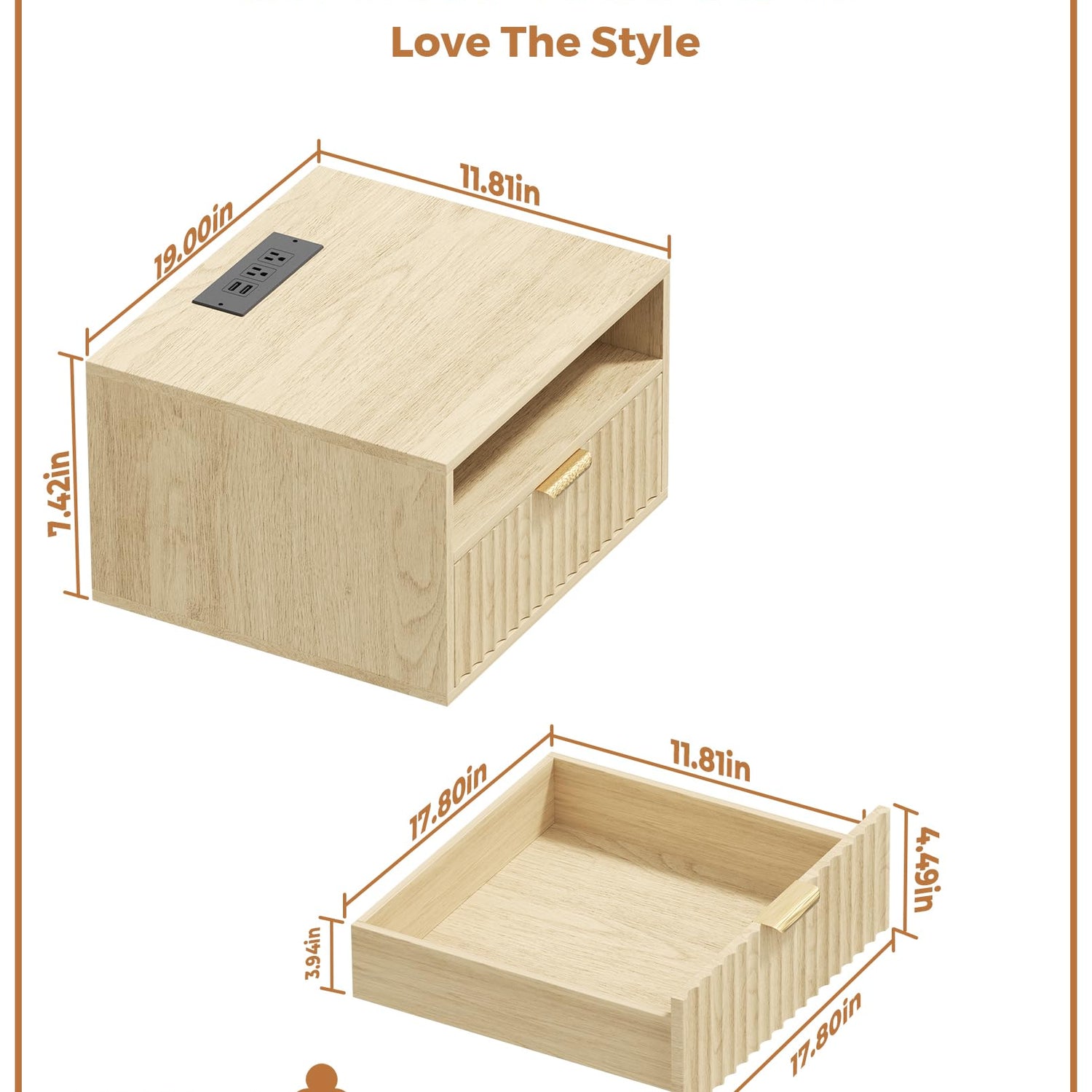 Floating Nightstand Set of 2 - Fluted Night Stand with Charging Station Wood Wall Mounted Nightstand with Drawer & Open Shelf, Modern Bedside Table Large End Table for Bedroom Closet
