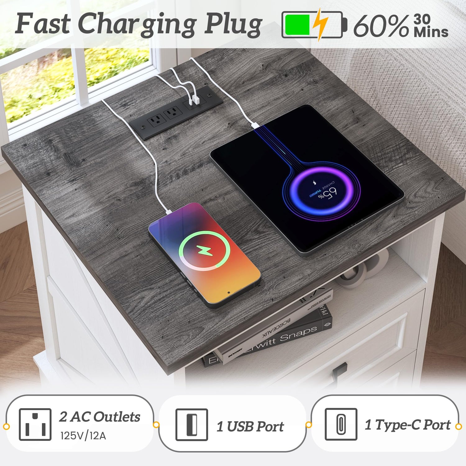 Fluest 24" Tall Farmhouse Nightstands Set of 2, Night Stands with Charging Station, Beside Tables with Drawers and Open Storage, Rustic End Tables for Bedroom, Antique White
