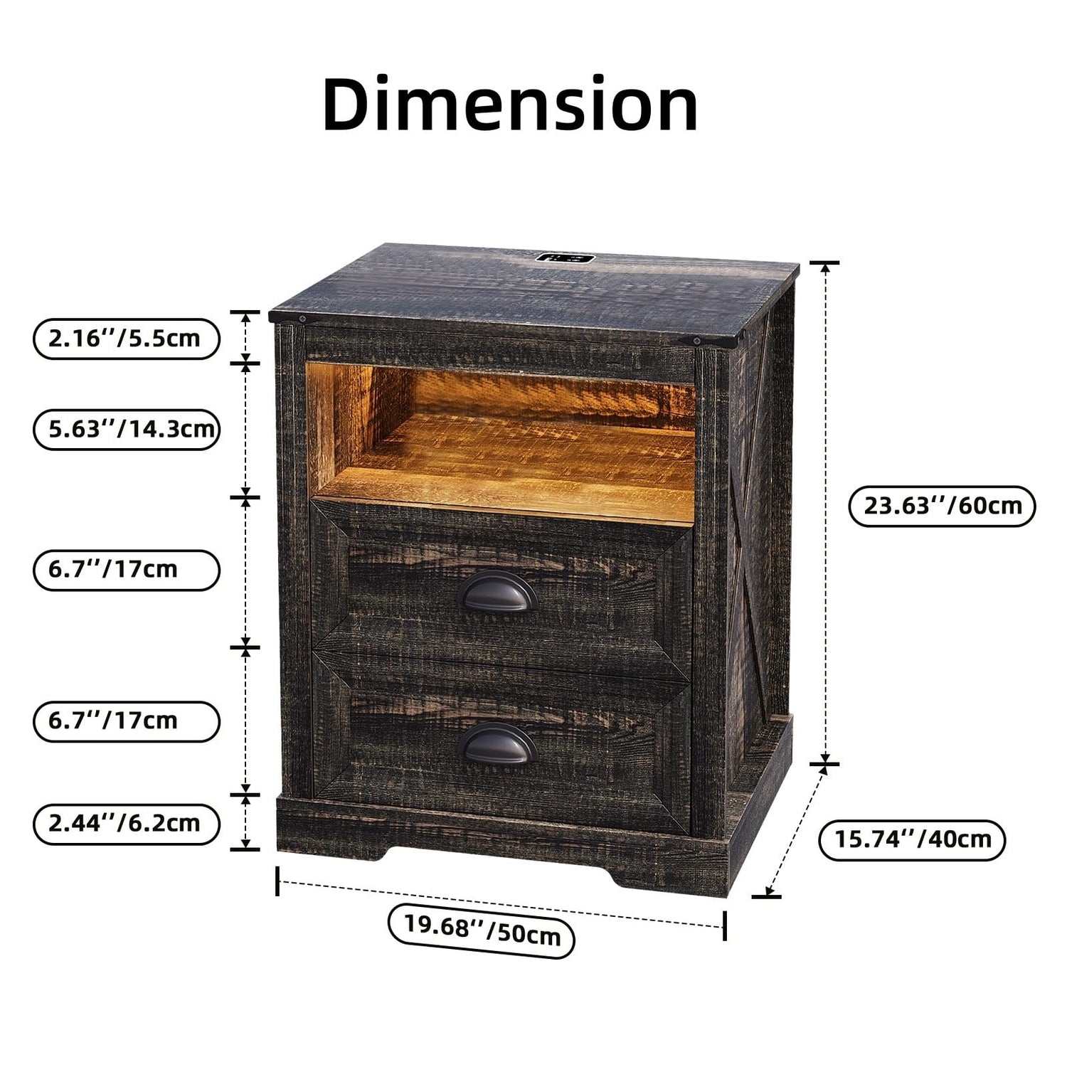 FONTOI Farmhouse Nightstand, End Table with Drawers & Charging Station, Bedside Table with 3 LED Lights Modes, Wood Nightstand with Smart Human Sensor for Bedroom, Brown, Set of 2