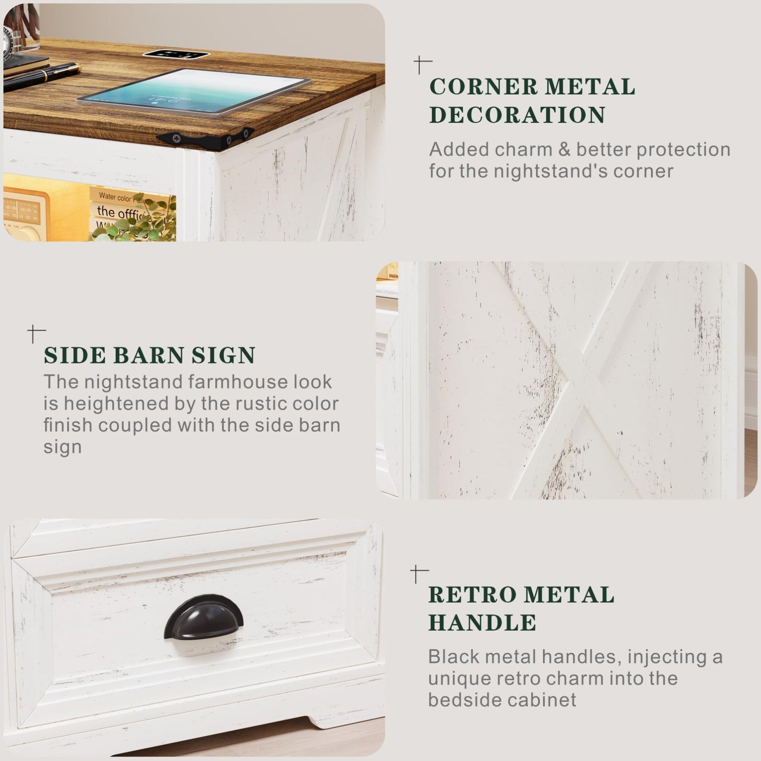 Details: FONTOI Farmhouse Nightstand, End Table with Drawers, Nightstand with Charging Station, Bedside Table with 3 LED Lights Modes, Wood Nightstand with Smart Human Sensor for Bedroom, Brown & White