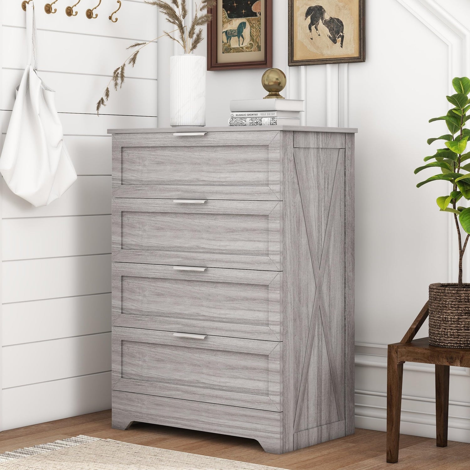 FTZxHKLX Farmhouse 4 Drawer Dresser for Bedroom, Tall Bedroom Dresser with Large Drawer & Silver Handles, Wooden Storage Organizer Cabinet Chest of Drawer for Closet, Living Room, Hallway, Wash Grey