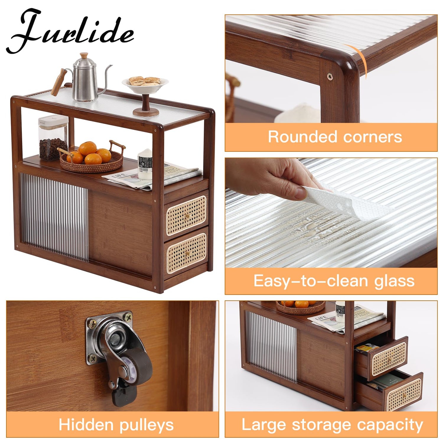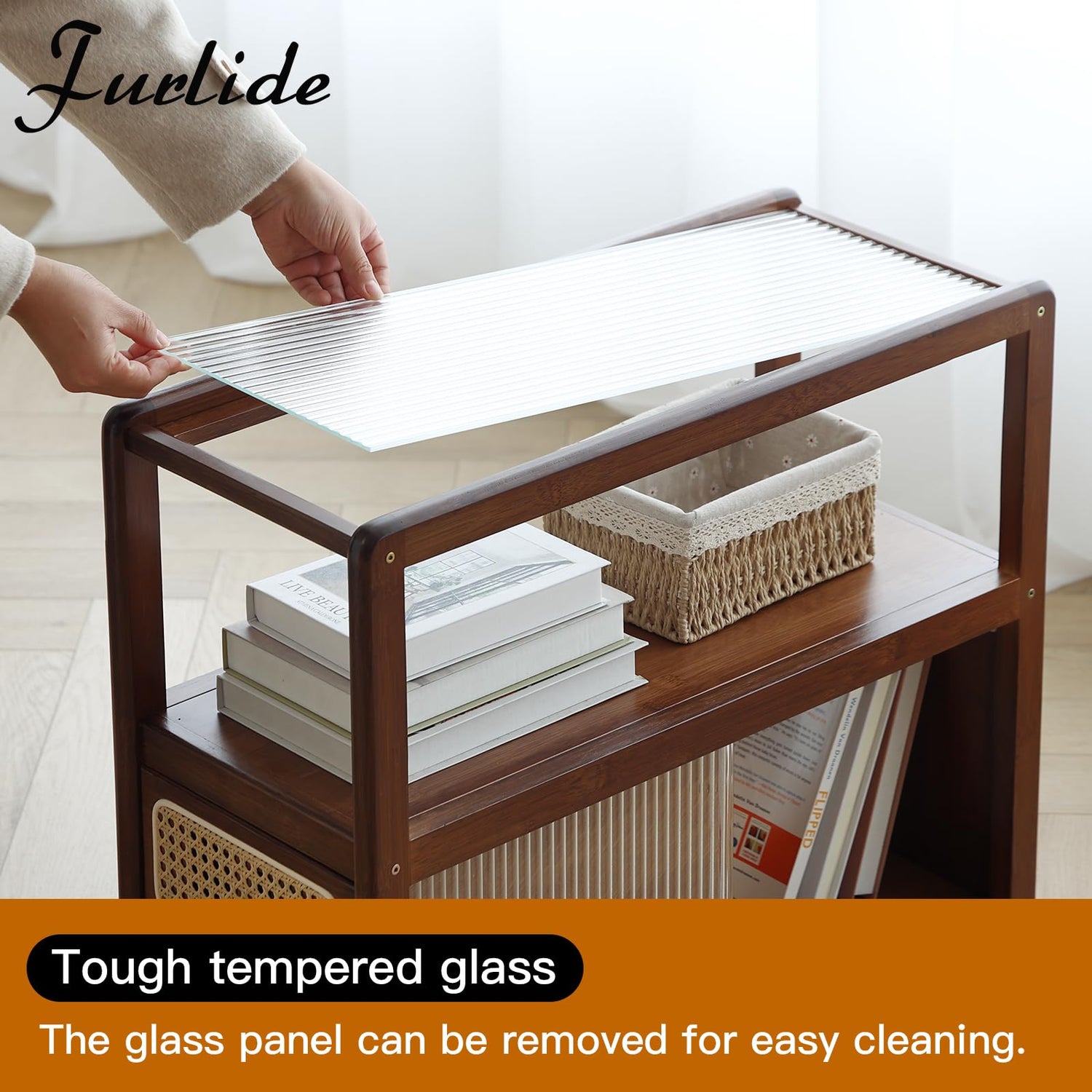 Furlide Rattan Side Table with Storage, Bamboo Nightstand Bedside Table, Glass Mid Century Modern End Tables for Small Spaces, Living Room, Bedroom,Walnut