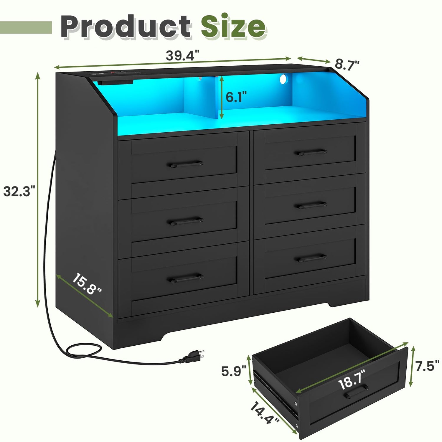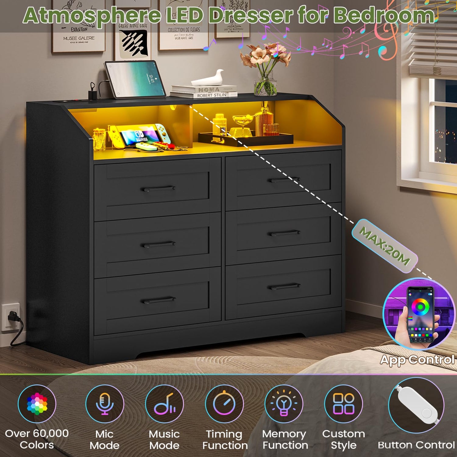 Hasuit Black Dresser with LED Lights and Charging Station, Chest of 6 Drawers with Open Space, Modern Wood Storage Tower Clothes Organizer, Storage Cabinet with Deep Drawers, Black Dresser for Bedroom