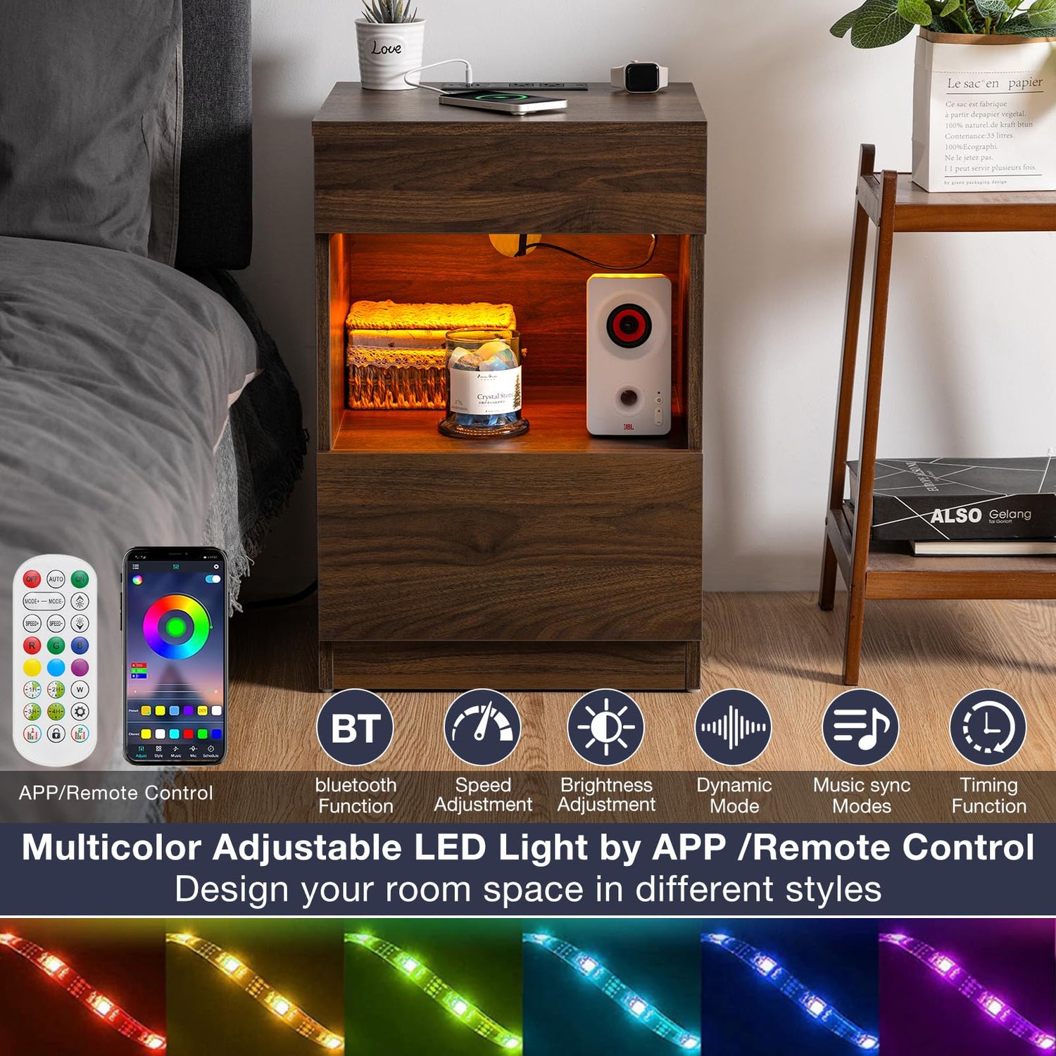 - 【APP & Remote Control RGB LED Light】The brown nightstand modern is equipped with intelligent multicolor RGB LED lights, can be adjusted by the APP Bluetooth and button remote control (multiple colors modes, brightness, music mode, timing function), to design your light show as you like.