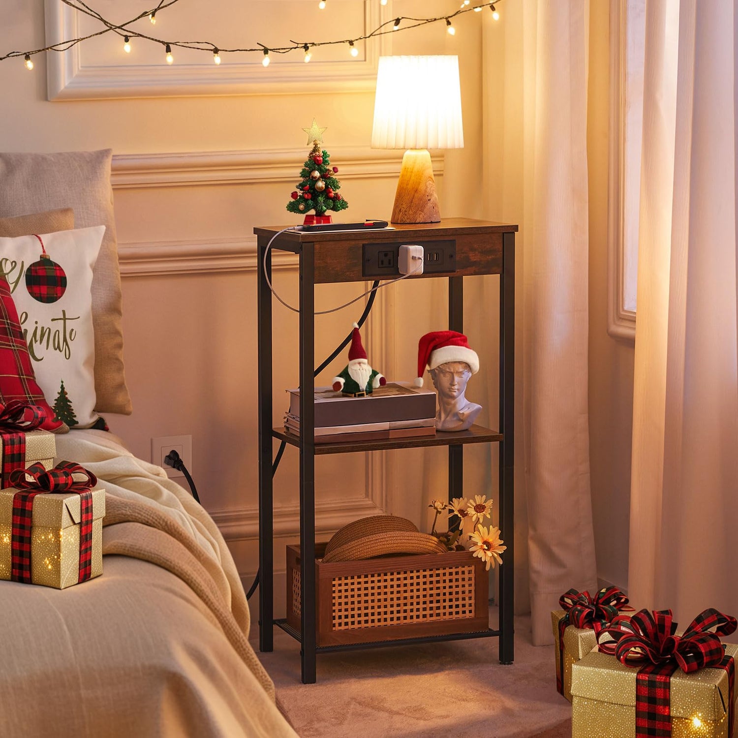 HOOBRO Tall End Table with Charging Station, 30 Inch Tall Nightstand, 3-Tier Side Table with Storage Shelves, for Living Room, Bedroom, Hallway, Rustic Brown BF09UDH01