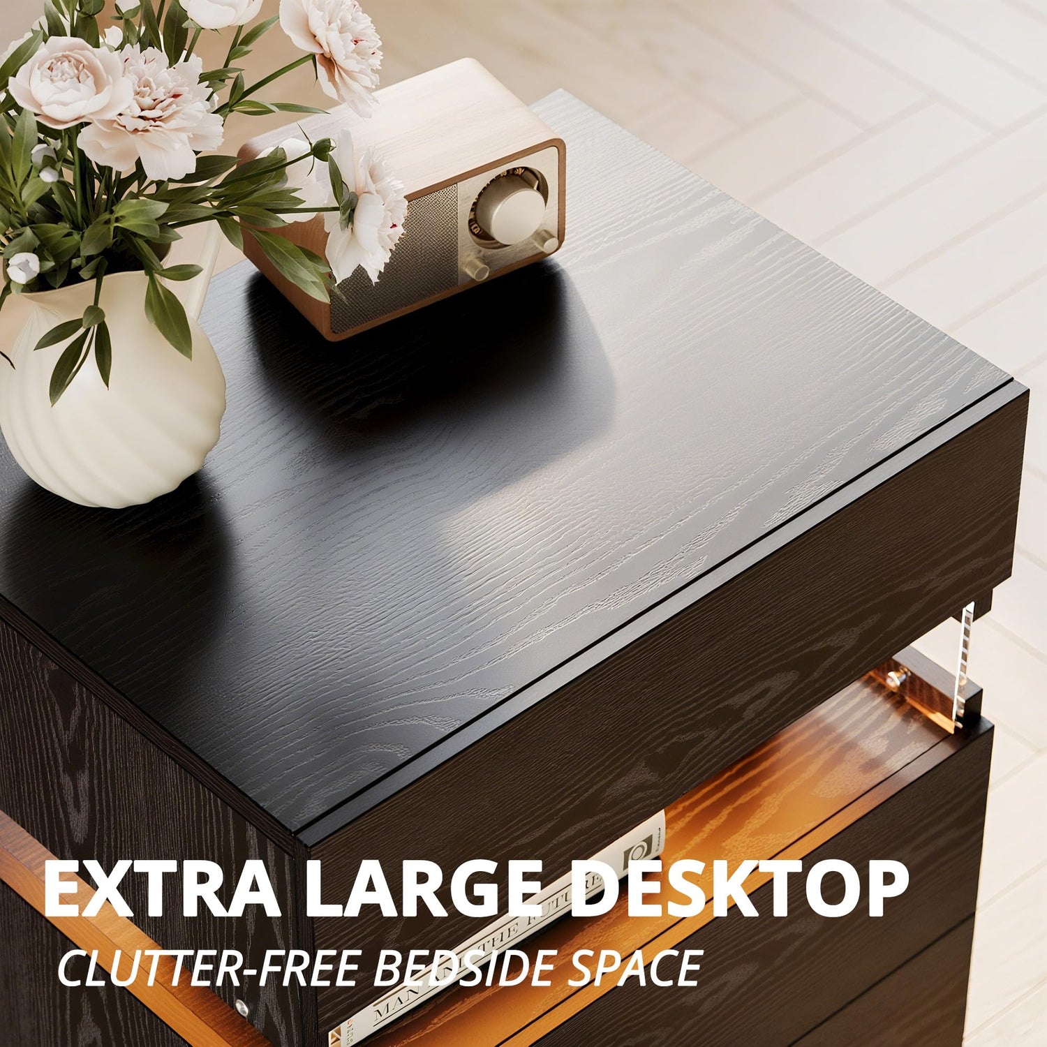 - 3 Drawers Storage:This black nightstand combines generous storage with whisper-quiet functionality. Three silent-close storage drawers and an open compartment provide effortless organization, while upgraded capacity means everything has its place—elegantly out of sight, instantly within reach.