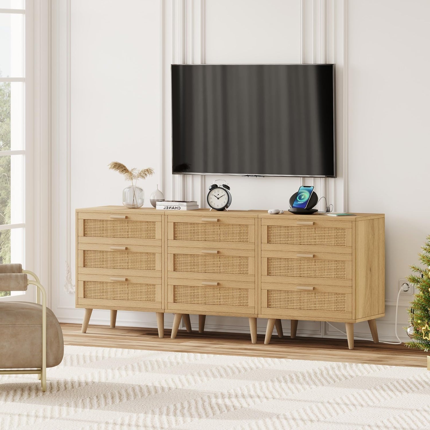 Irontar Set of 2 Rattan Nightstand with Charging Station, Night Stand with 3 Large Rattan Drawers, Accent End Table, Bedside Table with Solid Wooden Legs for Bedroom, Natural BZZ006ME02