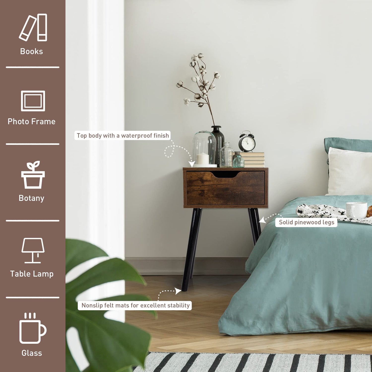 - Versatile Style: Sleek, retro design with a brown drawer and black legs brings mid-century charm to your bedroom, living room, or office. Perfect as a nightstand, end table, or accent piece