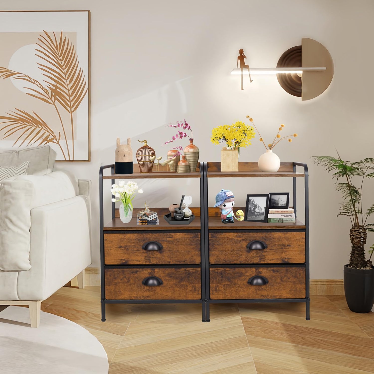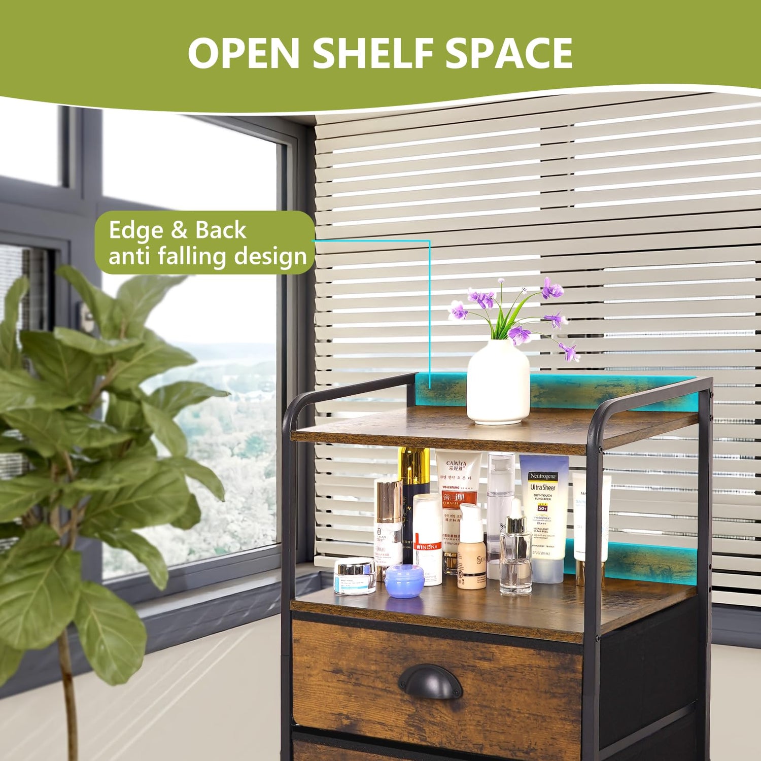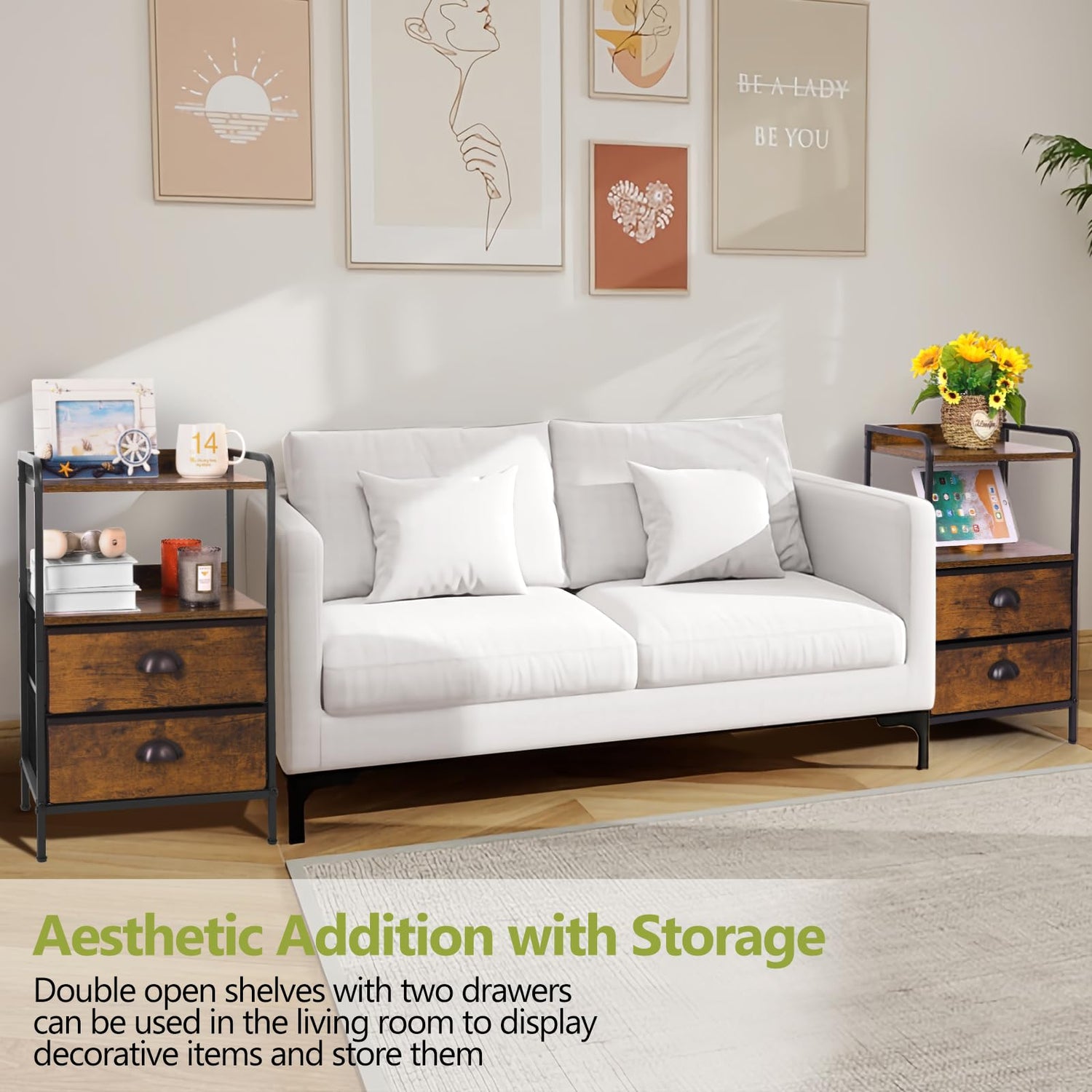 Jixlantuc Night Stand Bedside Table Bedroom Nightstand with Open Shelf Bed Side Table with Fabric Drawers End Table with 2 Drawer Storage Night Stands for Living Room Rustic Brown Black