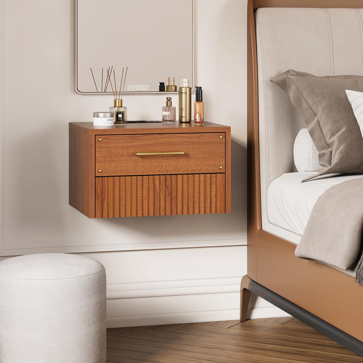 JOINICE Floating Nightstand Set of 2 with Charging Station, Mid Century Modern Wood Wall Mounted Bedside Table with Storage Drawers & Fluted End Table for Bedroom, Home Small Space, Cherry, 2 PCS