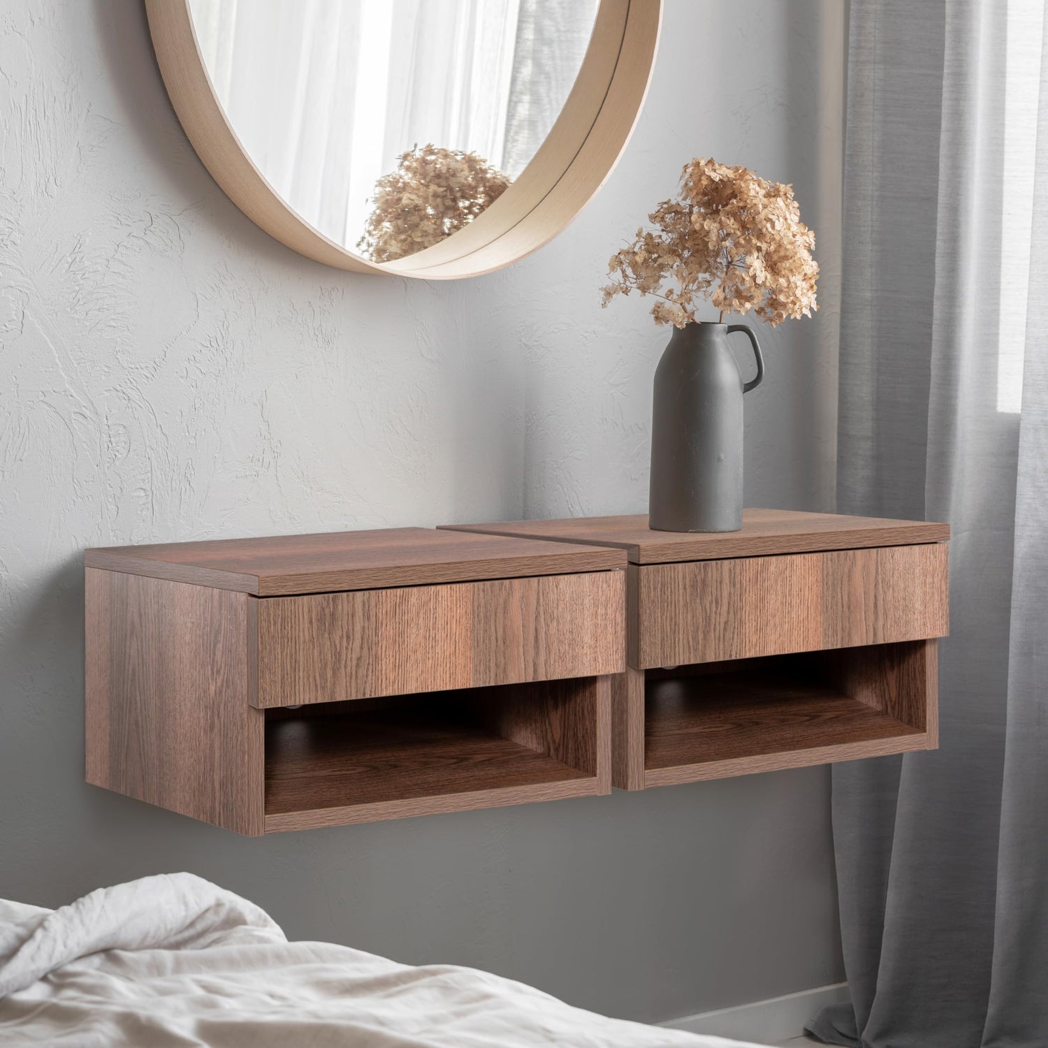 Details: Add convenient storage to your bedroom with our modern floating nightstands. Inspired by mid-century designs, ours feature durable MDF construction with a sleek, minimalist drawer style and an open shelf. Tuck one into a tight corner, or buy two for perfect symmetry.