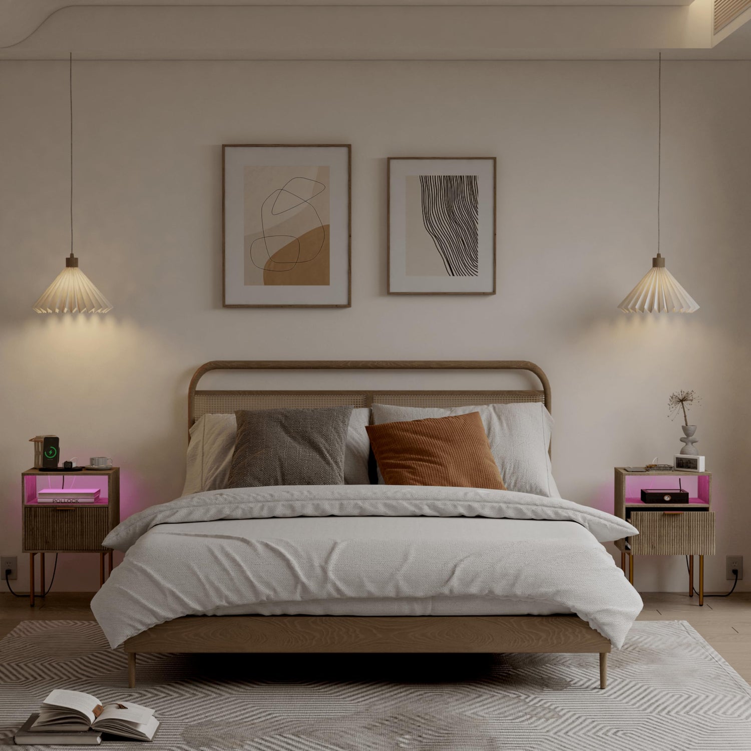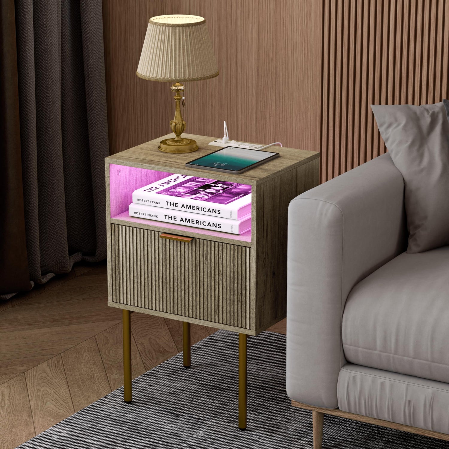 JOONEE Modern Nightstand with Charging Station and LED Lights, White Bedside Table with Drawer, Fluted Side Table for Living Room, Bedroom