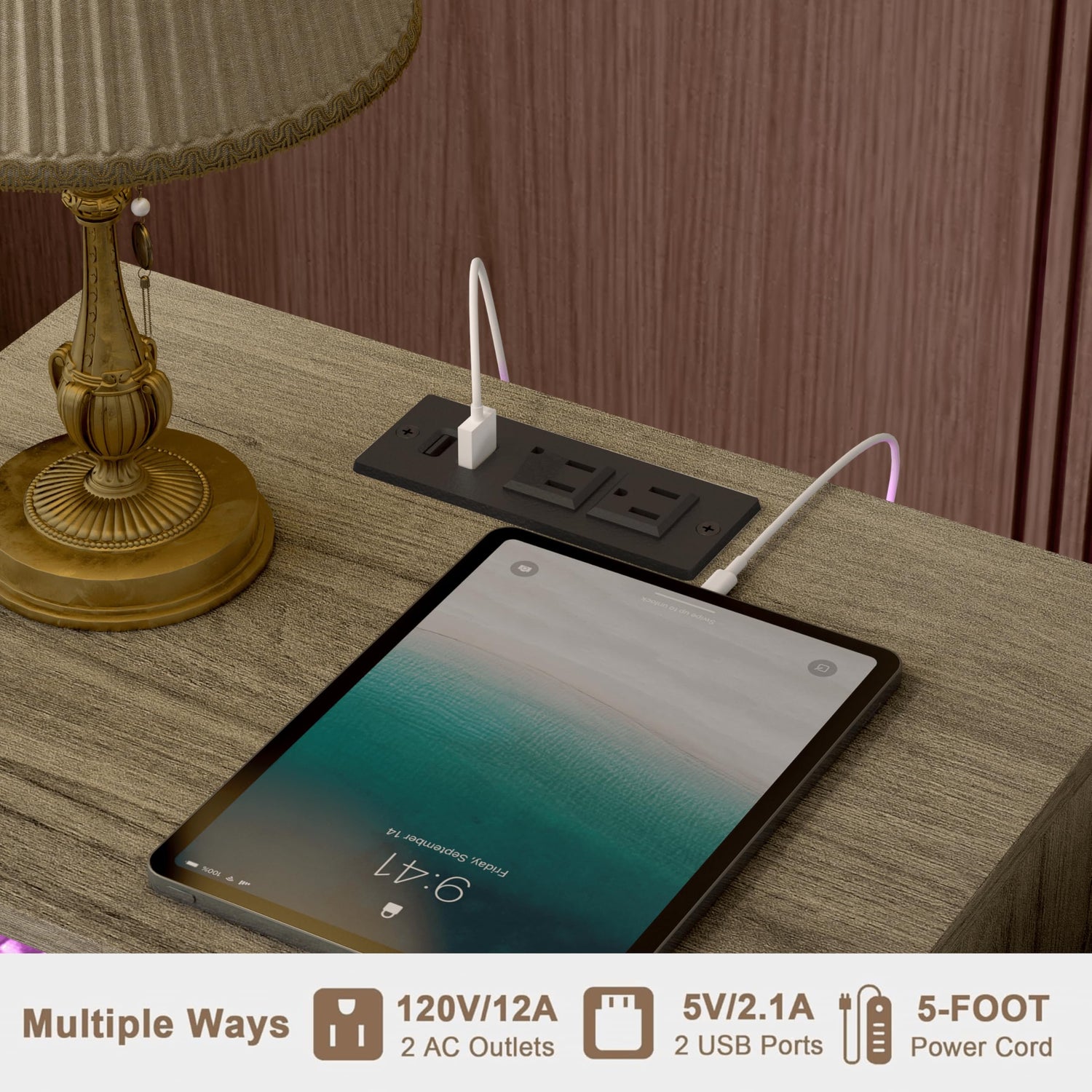 - Charge-Up Is Easy: Introducing the JOONEE small nightstand, the answer to outlet scarcity! With its two AC power outlets and two USB connections, this bedside table can meet all of your charging demands. Additionally, this modern nightstand's strategically positioned outlets charge numerous gadgets effectively and without disturbance.