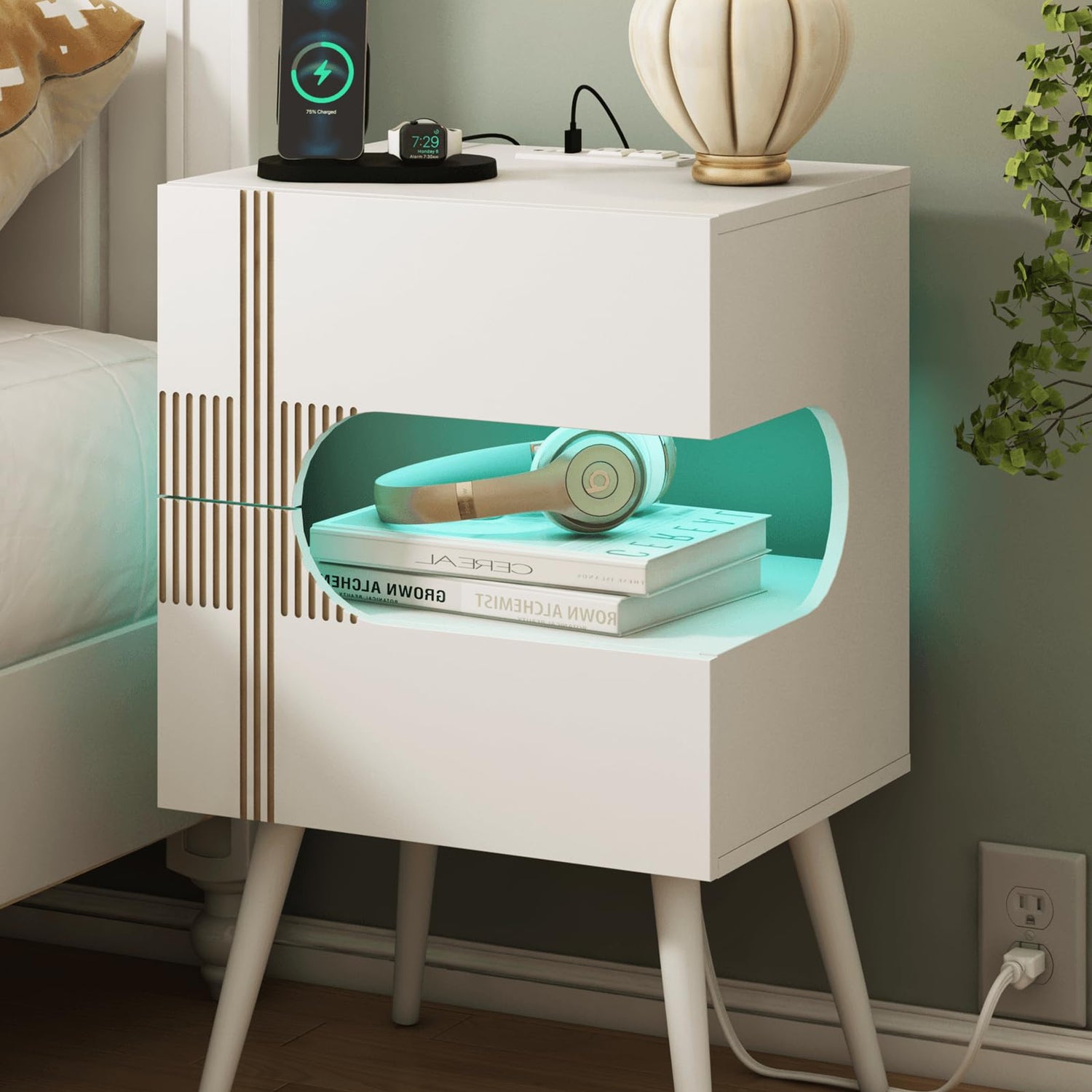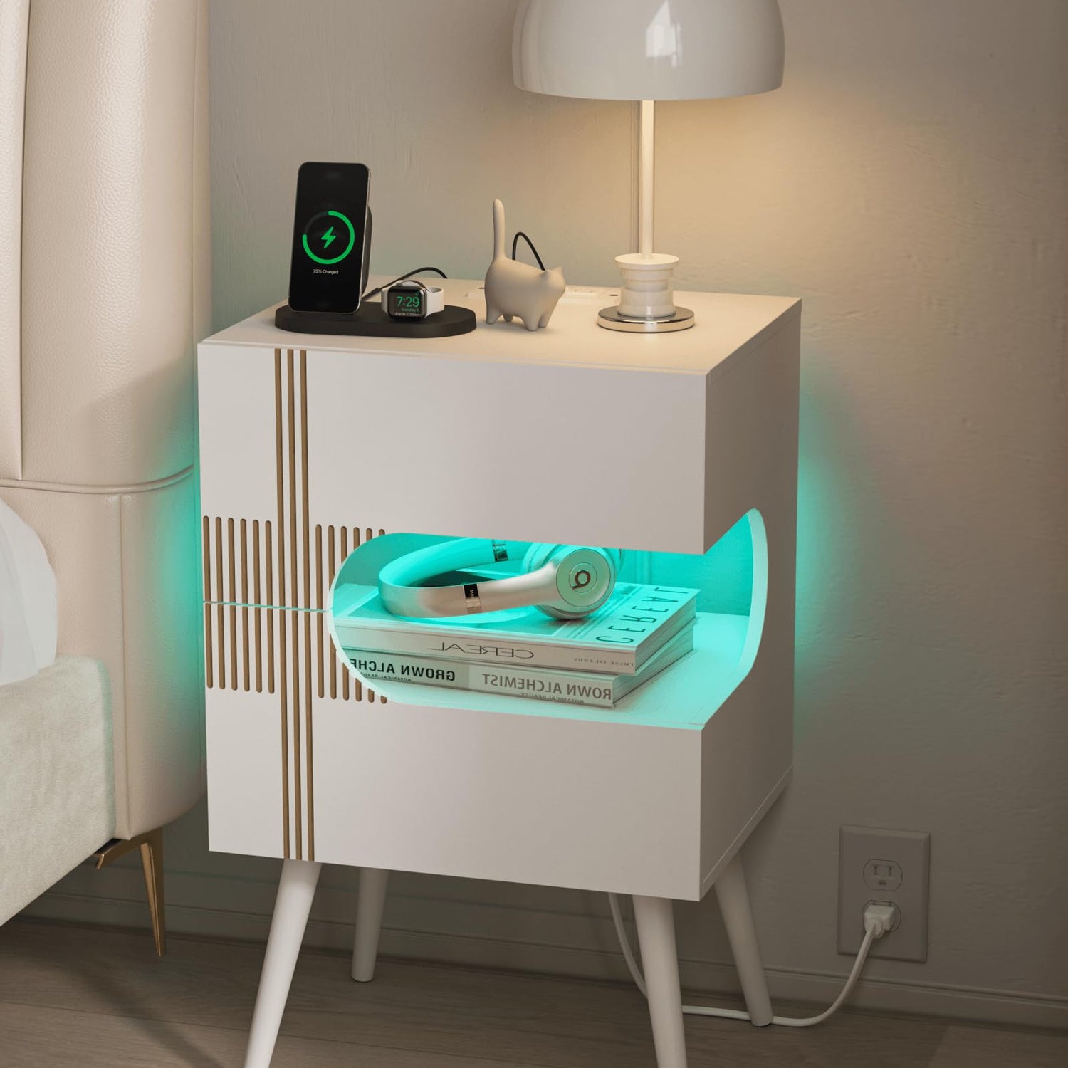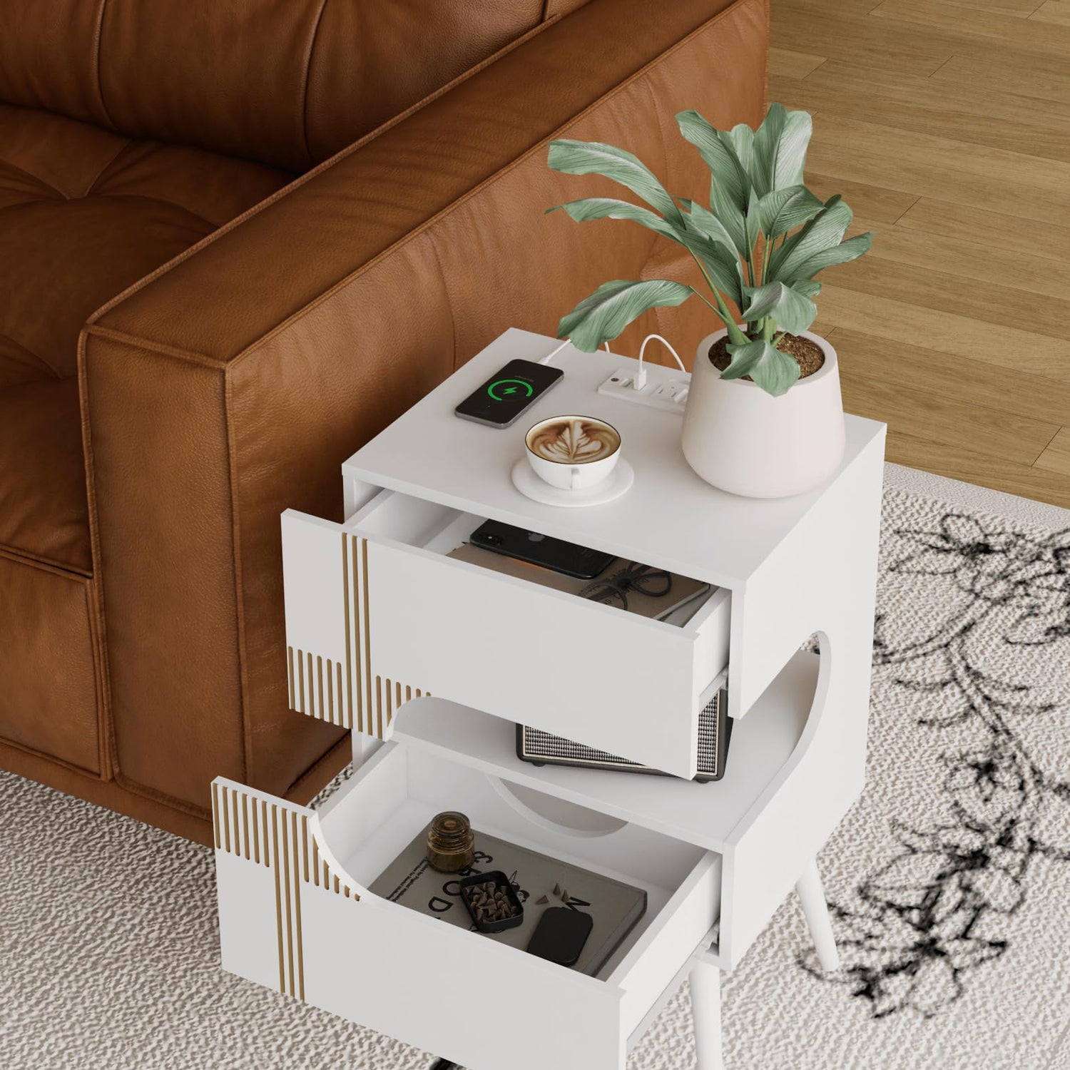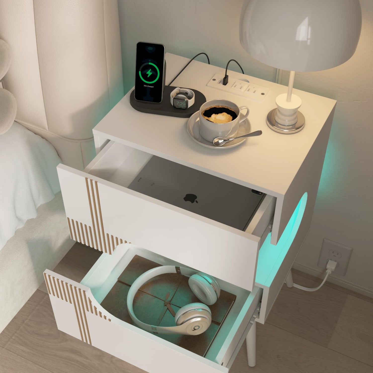 JOONEE White Nightstand with Charging Station and LED Lights,Modern Bedside Table with 2 Storage Drawer,Night Stand with Solid Wood Legs,White (White-2)