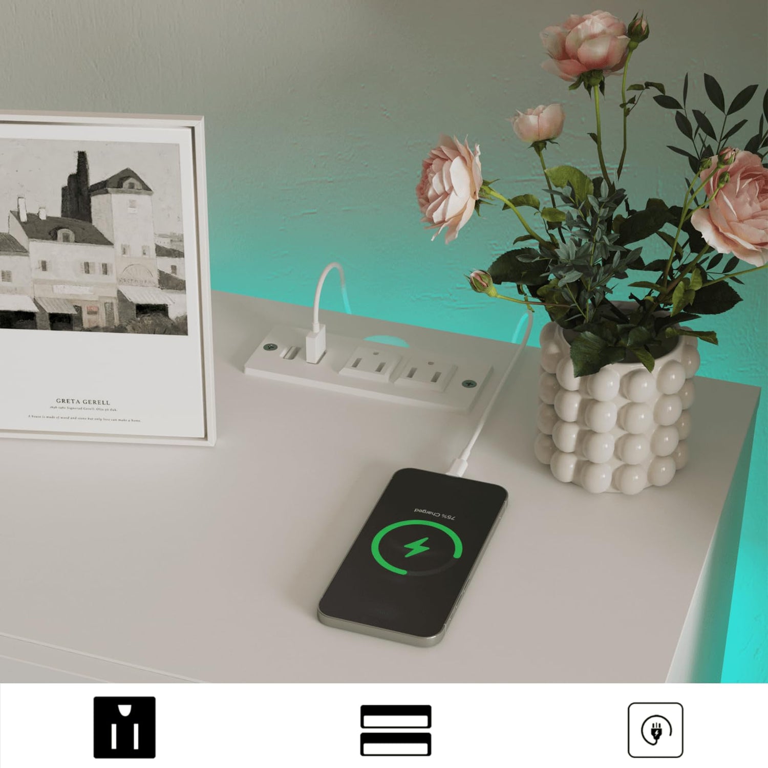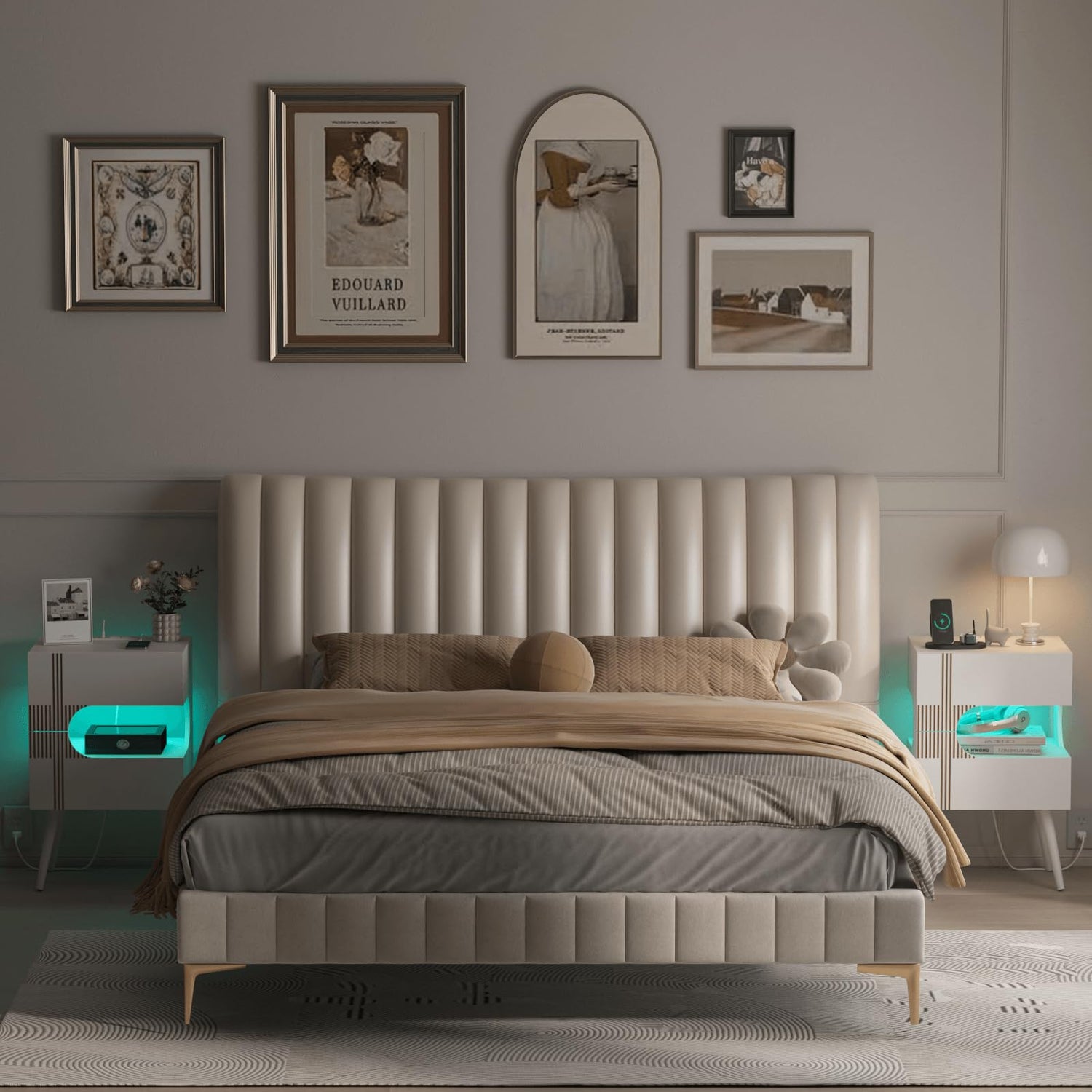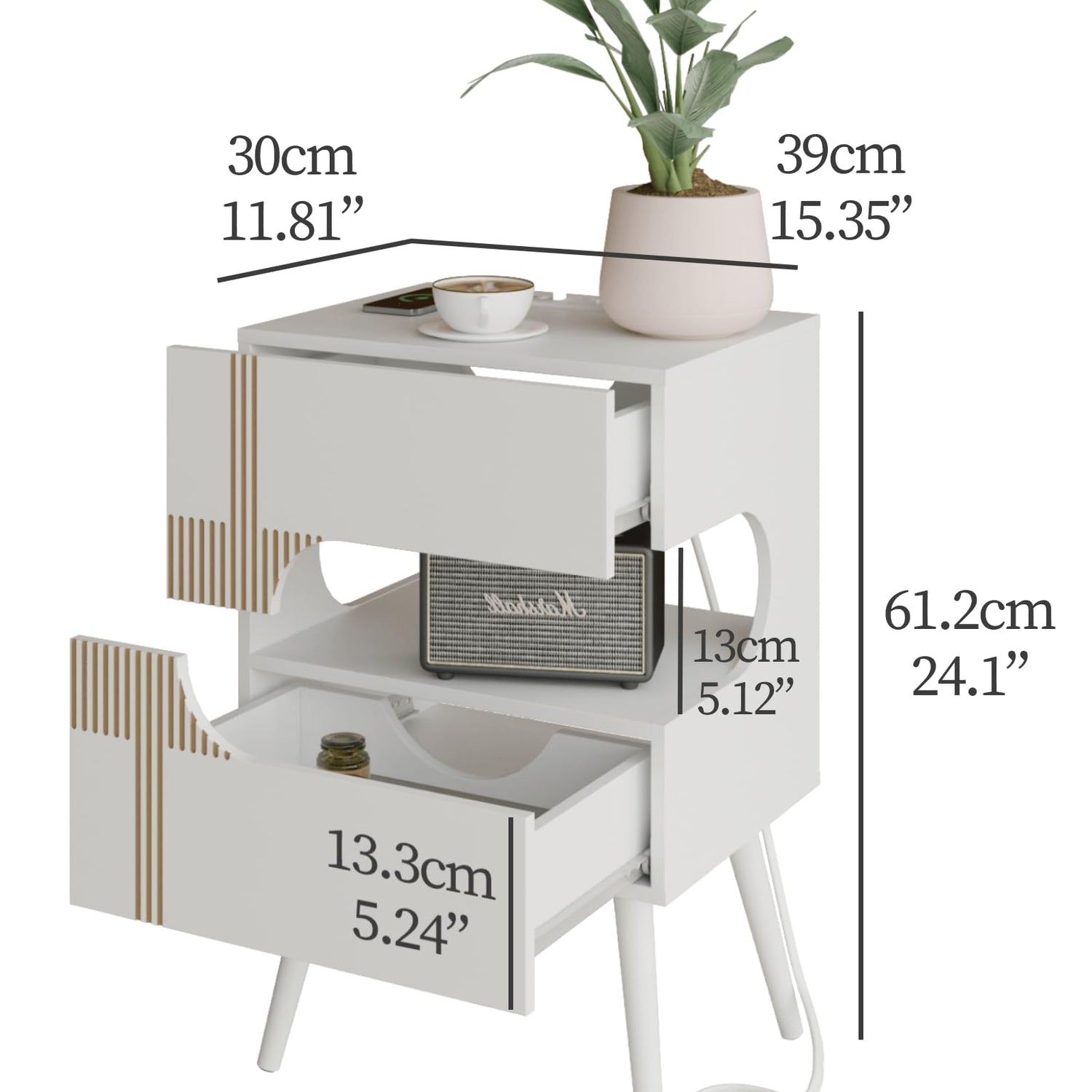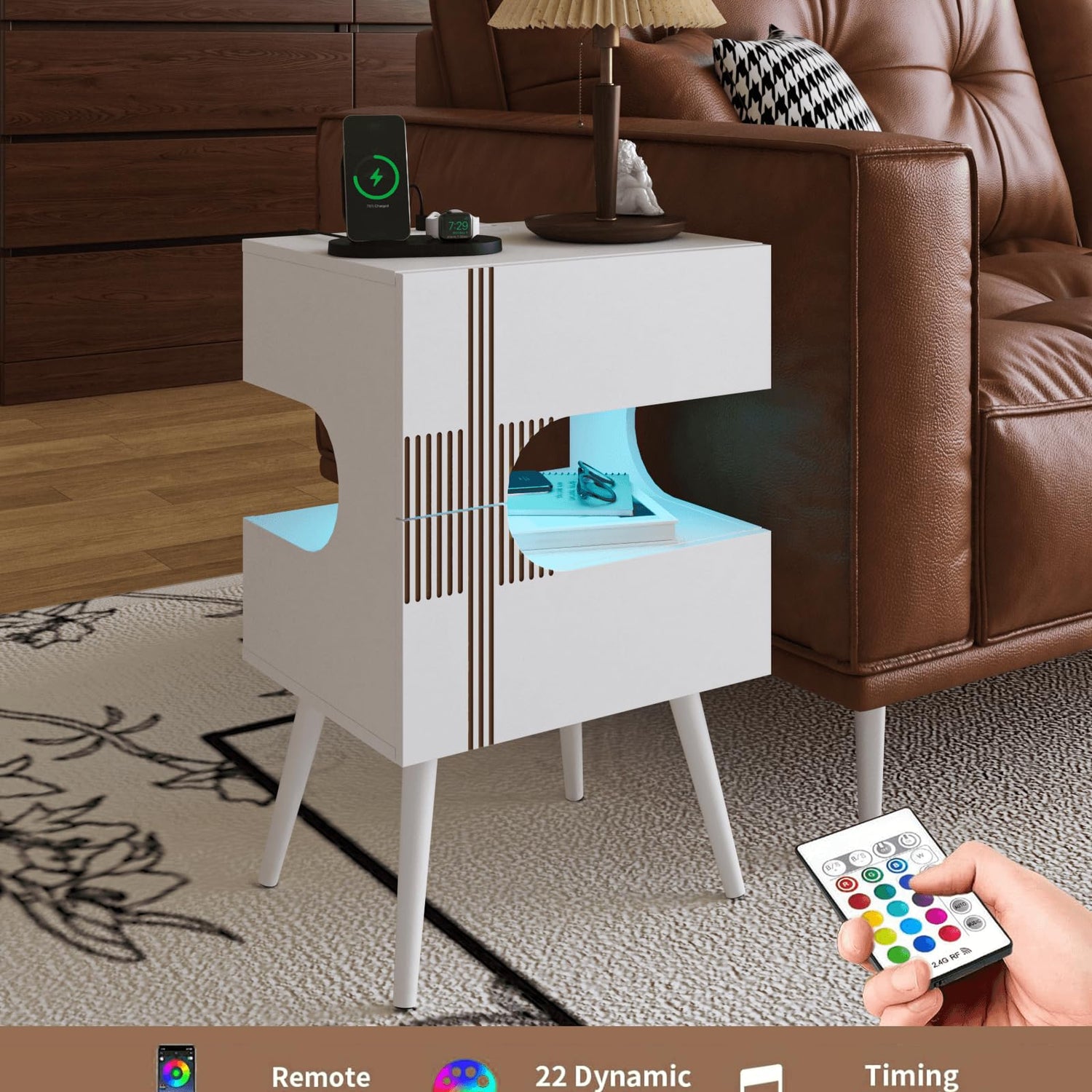 JOONEE White Nightstand with Charging Station and LED Lights,Modern Bedside Table with 2 Storage Drawer,Night Stand with Solid Wood Legs,White (White-2)
