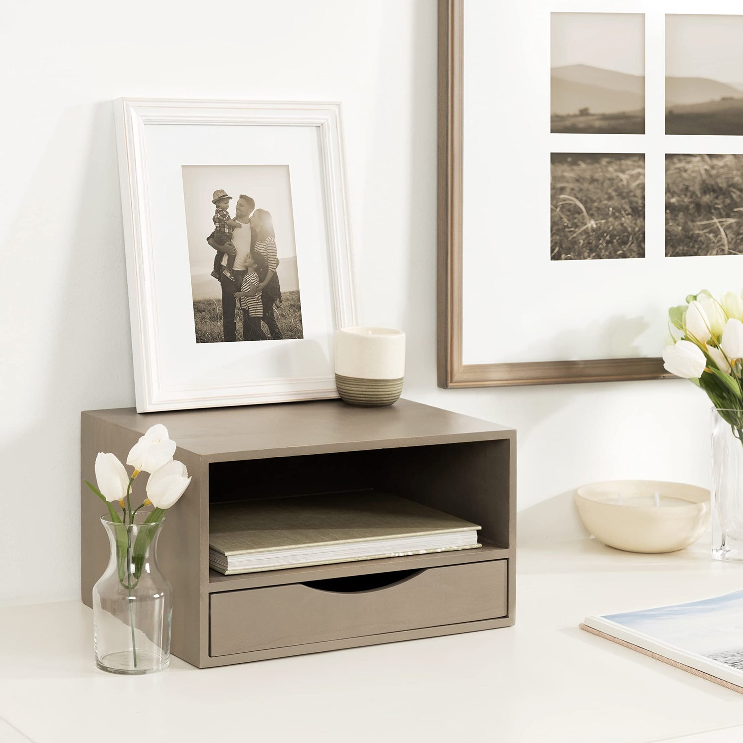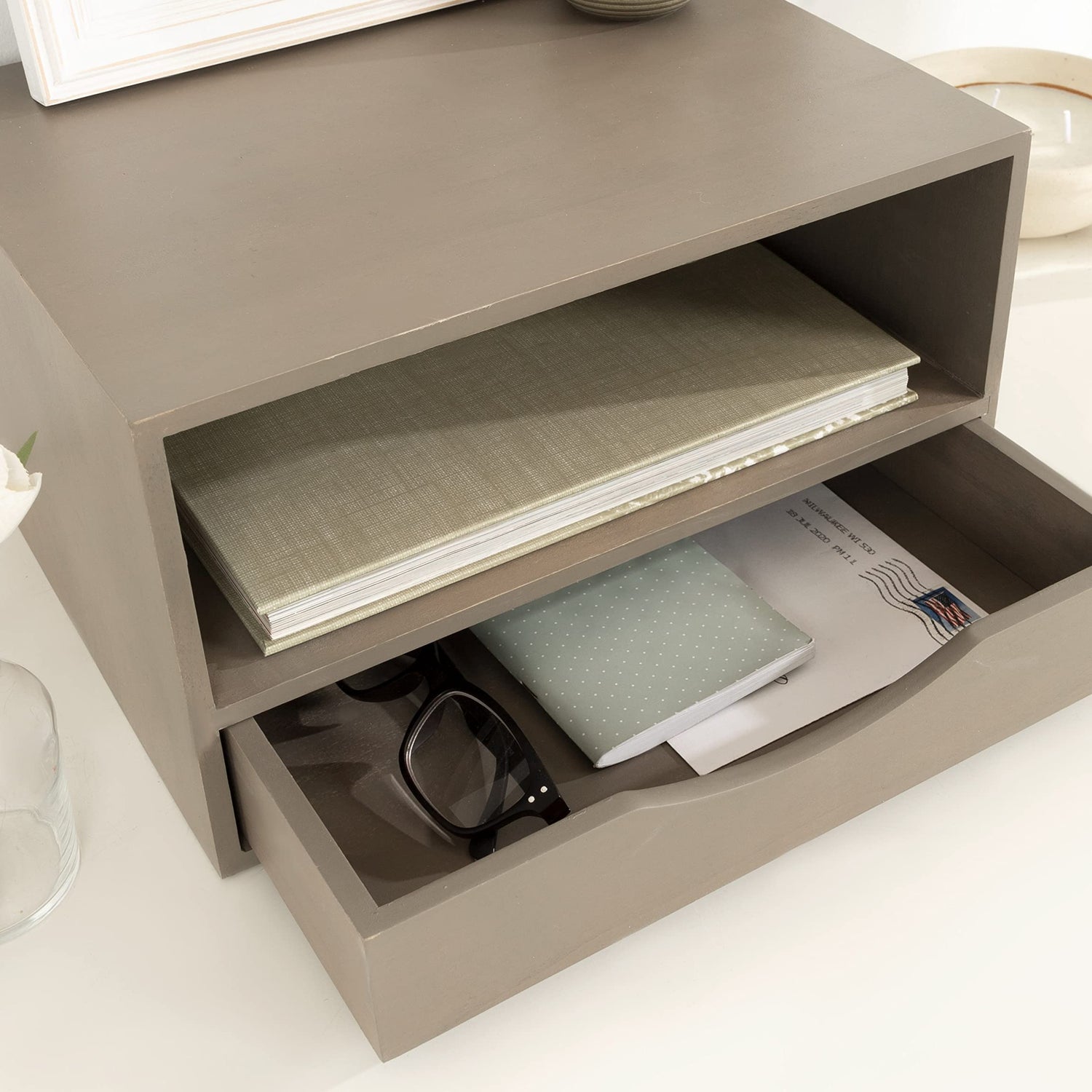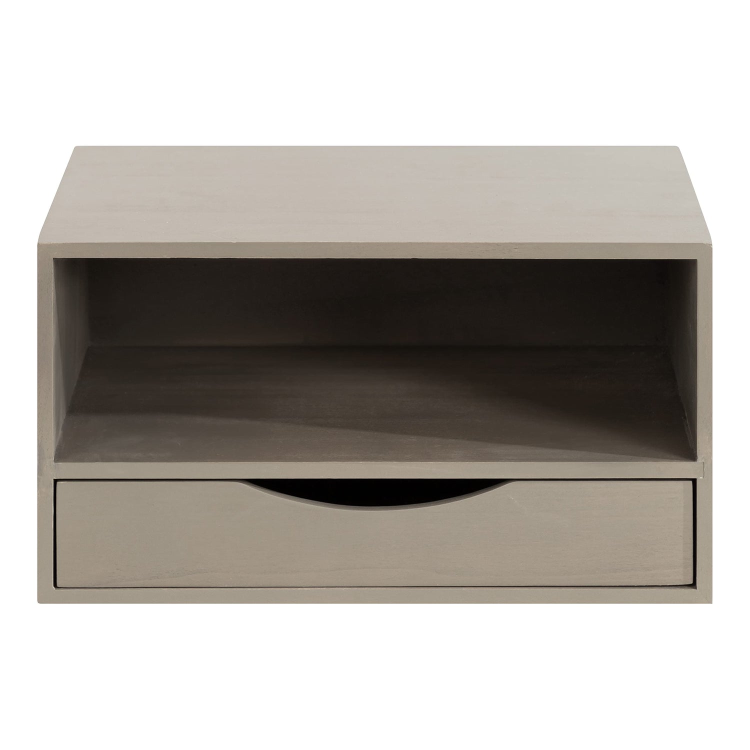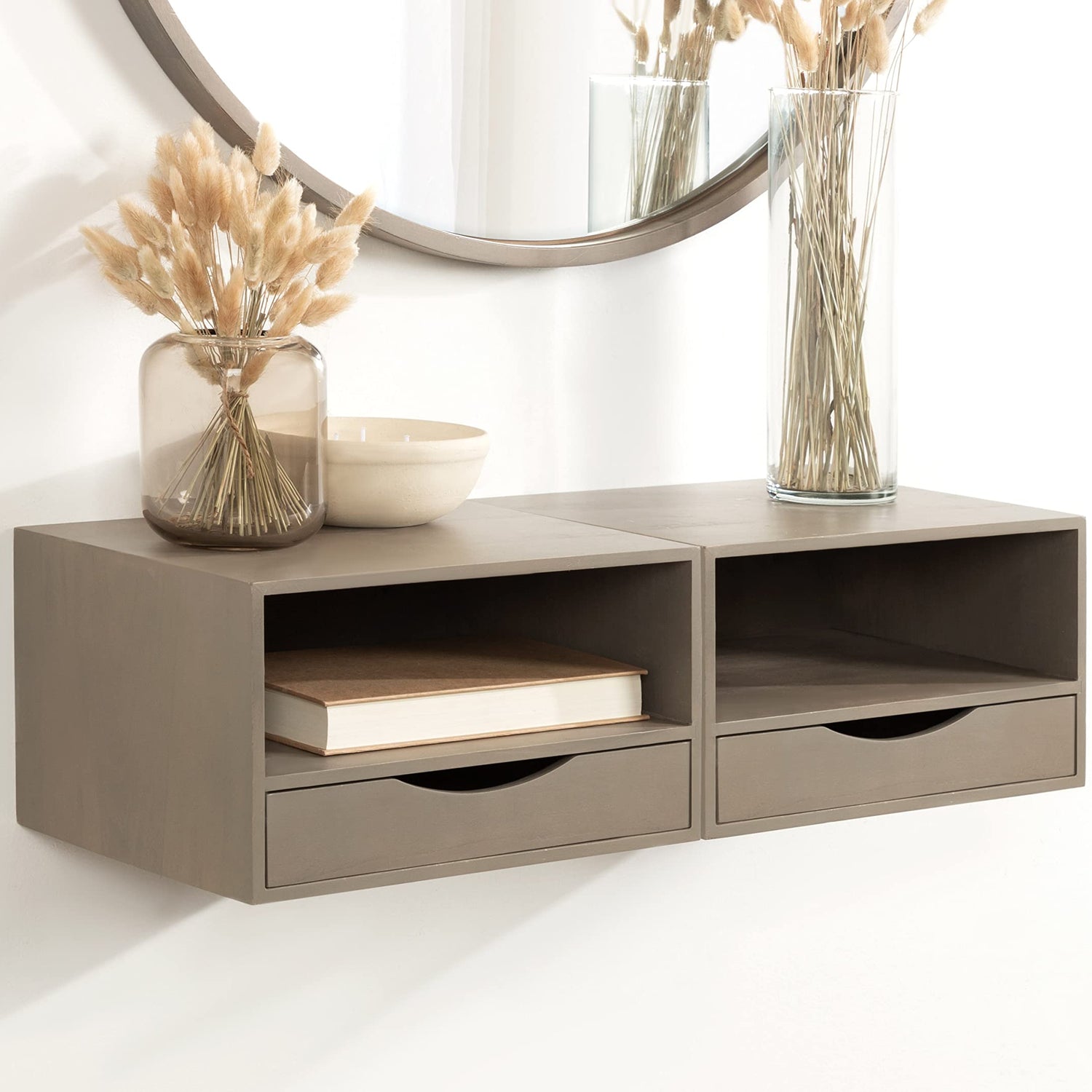 Details: Add a storage accent to your home that saves floor space with the bold and modern Hutton! The Hutton floating shelf has a neutral graywash finish that can fit into various decor aesthetics while having a flexible and functional design. The body was made from robust poplar wood, giving it a distinct woodgrain and high quality. The Hutton shelf has a large display surface and features a lower cubby and pull-out drawer, allowing you to utilize it for multiple functions in your home. This floating shelf's overall dimensions are 12.5 inches wide by 10 inches deep by 7 inches tall for larger household necessities like a tablet, phone, or keys. The lower pull-out drawer is excellent as a catch-all for household necessities and supplies, measuring 12 inches wide by 9.5 inches deep by 2 inches tall. This Hutton isn't just fantastic for household storage and display, but you can also use it as a floating desk in a virtual learning environment or next to your bed. Hang this shelf with the included screws and anchors and pre-drilled holes in the back of the wood.