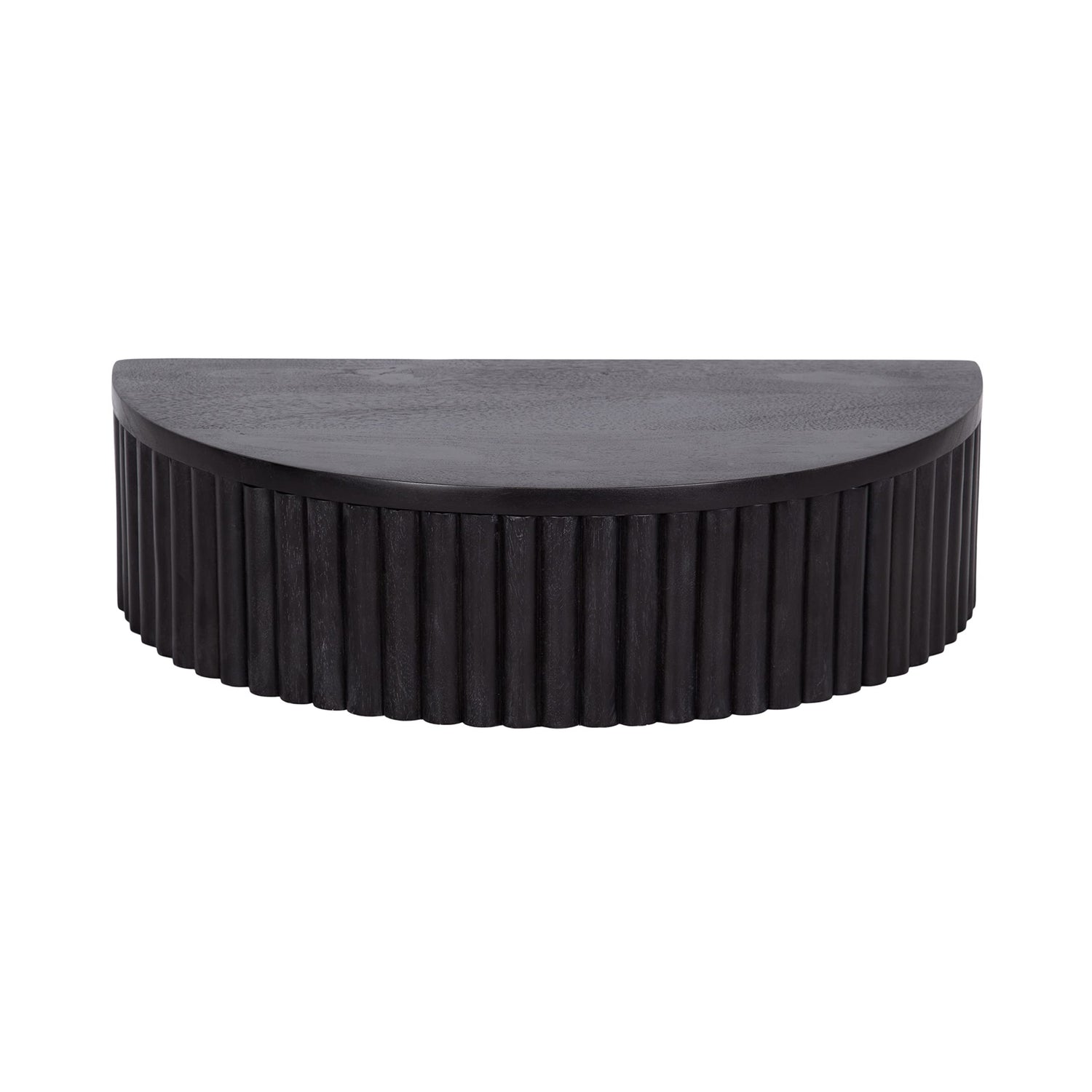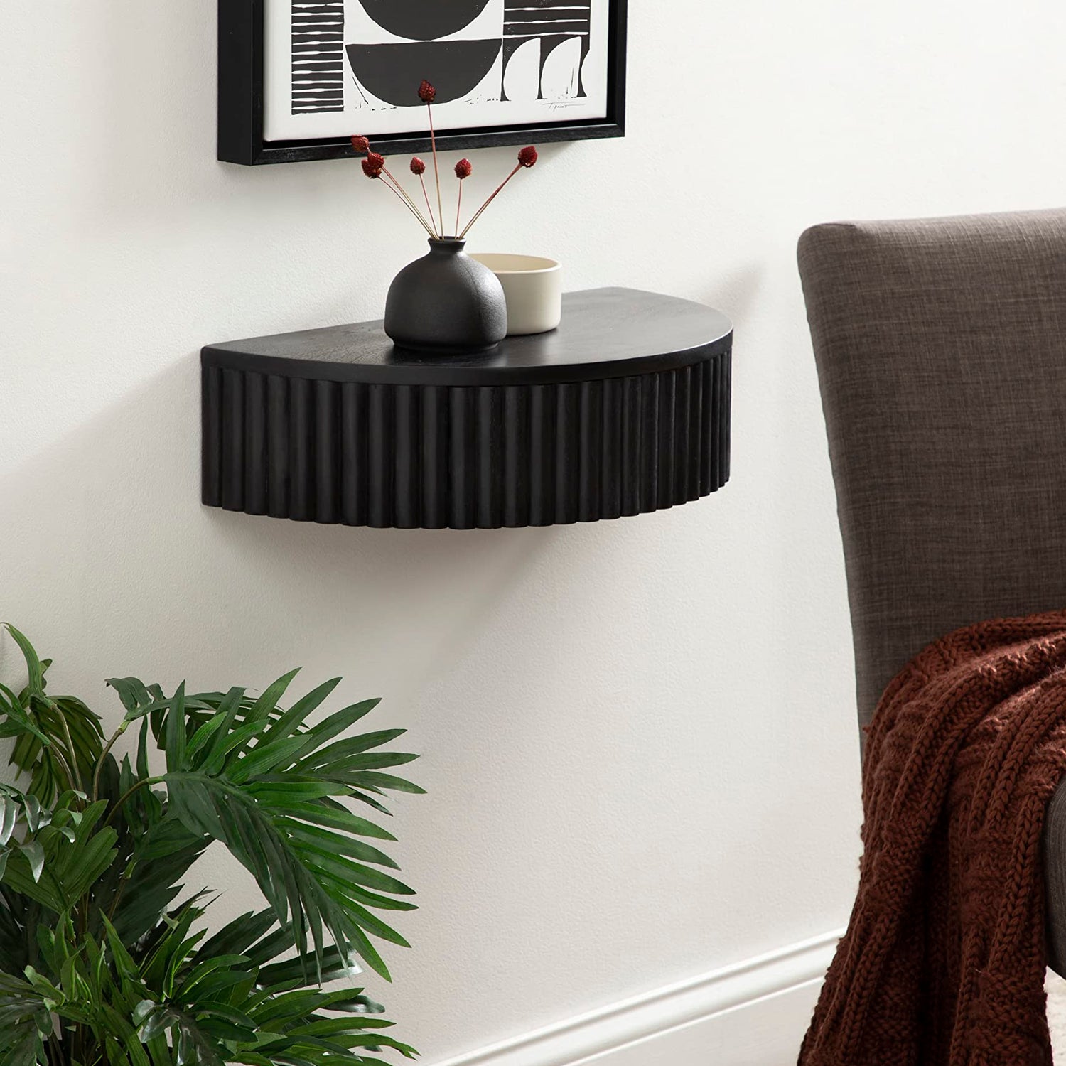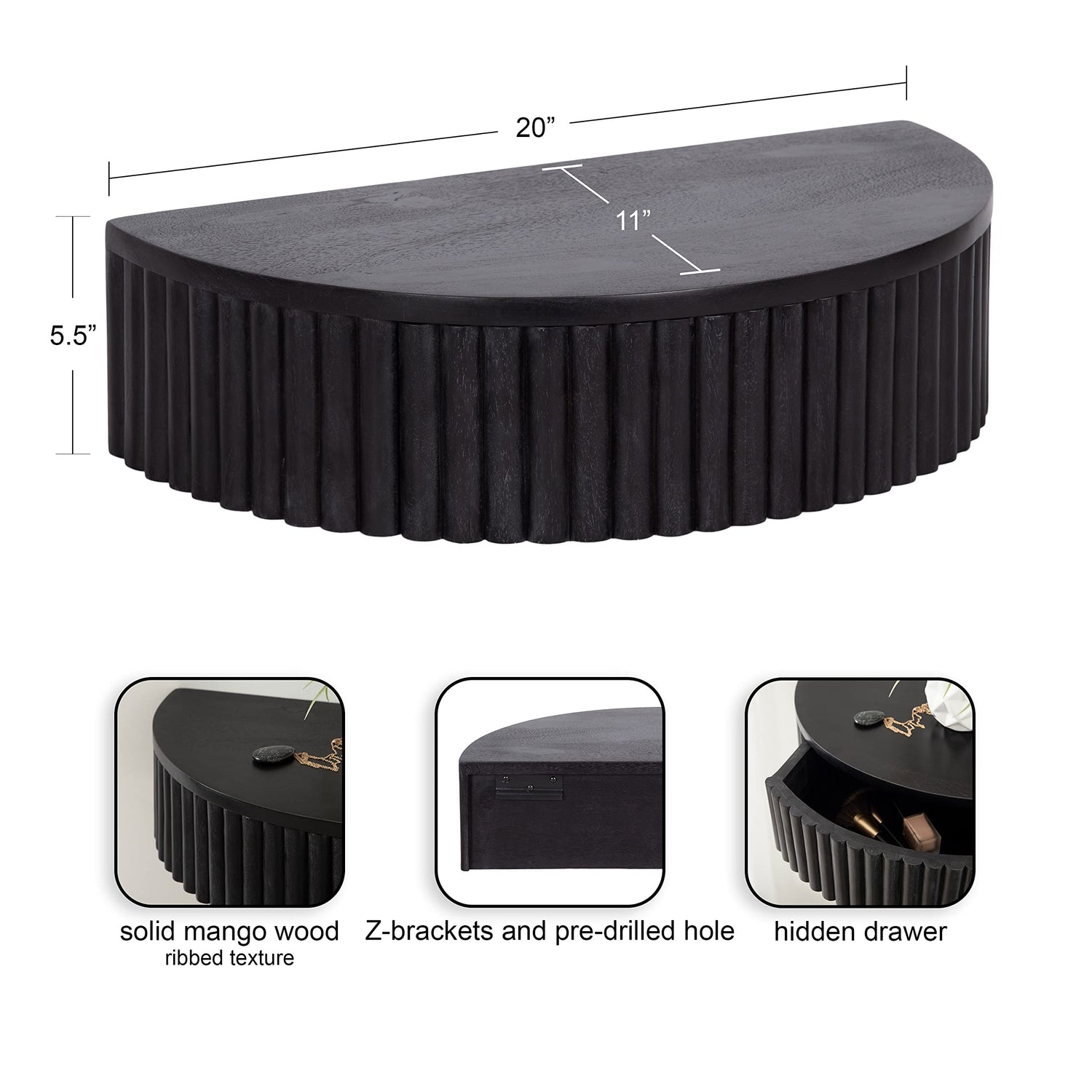 Details: Introducing the Reid ribbed floating side table, a stylish and functional addition to your home decor. This modern wood floating shelf is designed with a ribbed texture, adding a touch of sophistication to any room. The sleek black color of this floating side table adds a contemporary vibe to your space, making it a perfect fit for modern and minimalist interiors. Crafted from solid mango wood, it's built to last and withstand everyday use. The ribbed wooden construction adds a unique and eye-catching element, making it a focal point in any room. One of the standout features of this floating side table is the convenient drawer for extra storage. The drawer offers hidden storage space for keeping small items organized and out of sight, helping you maintain a clutter-free living space. It's perfect for storing remote controls, chargers, pens, or any other small items you want to keep within easy reach but neatly tucked away. The Reid side table is not only functional but also adds a touch of elegance to your home. Whether you use it in your living room, bedroom, or entryway, this floating side table is sure to enhance your home decor and provide extra storage and functionality. Invest in this table today and elevate your home decor to the next level. With its half-circle design, ribbed wooden texture, and a convenient drawer for extra storage, this modern wood floating shelf is a practical and stylish addition to any room. Measuring 20 inches wide by 11 inches deep by 5.5 inches tall, it's the perfect size to fit in small spaces while still providing ample storage and display options. Don't compromise on style or functionality - get your Reid side table now and transform your space into a sophisticated and organized haven.