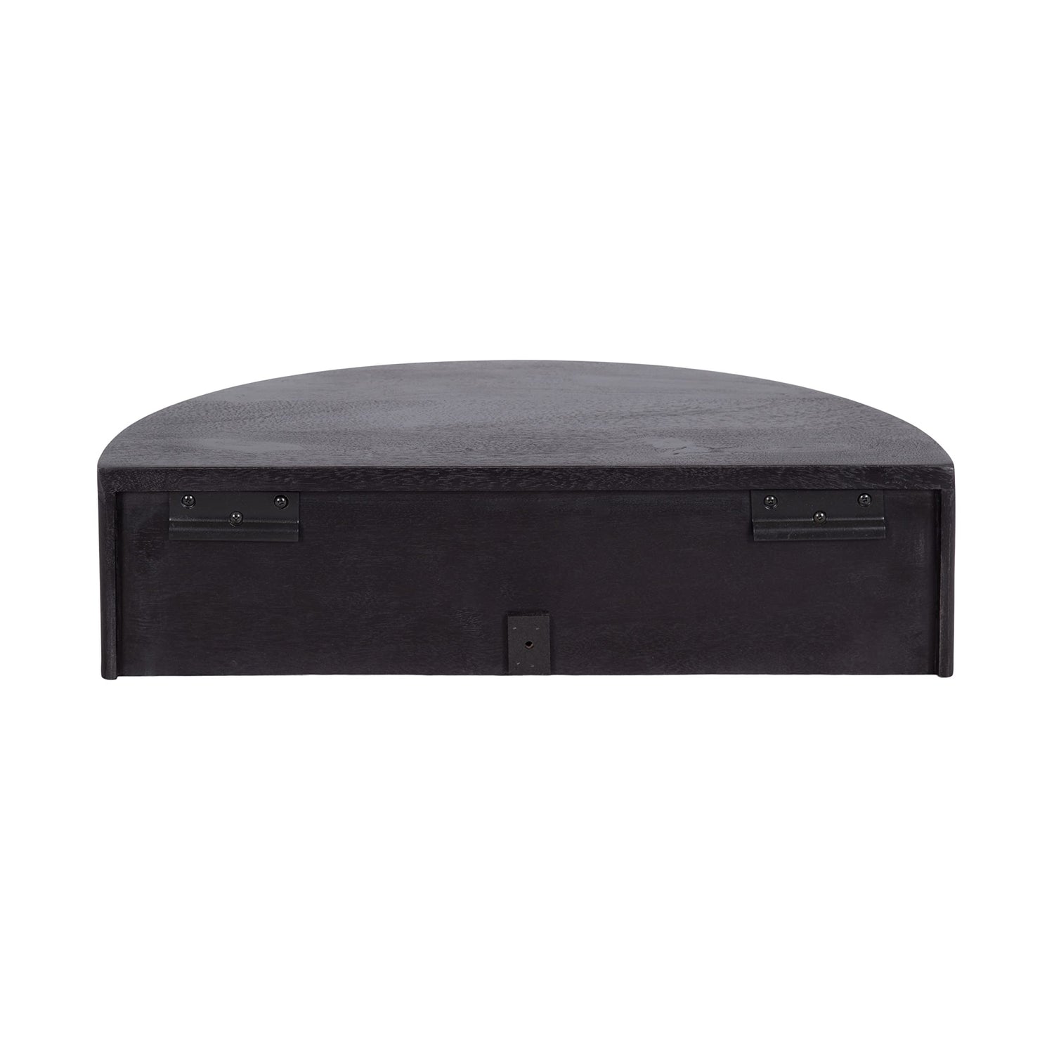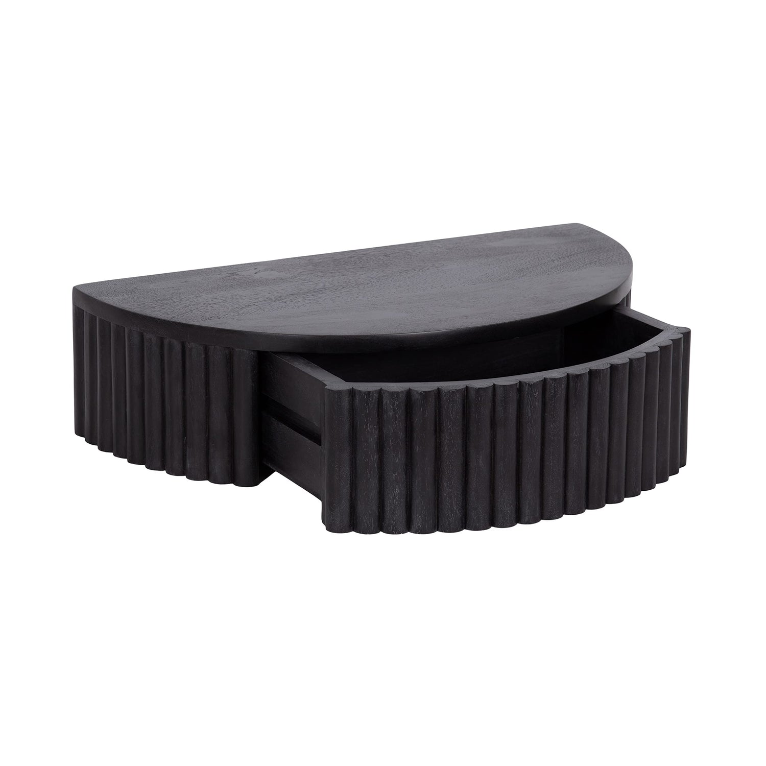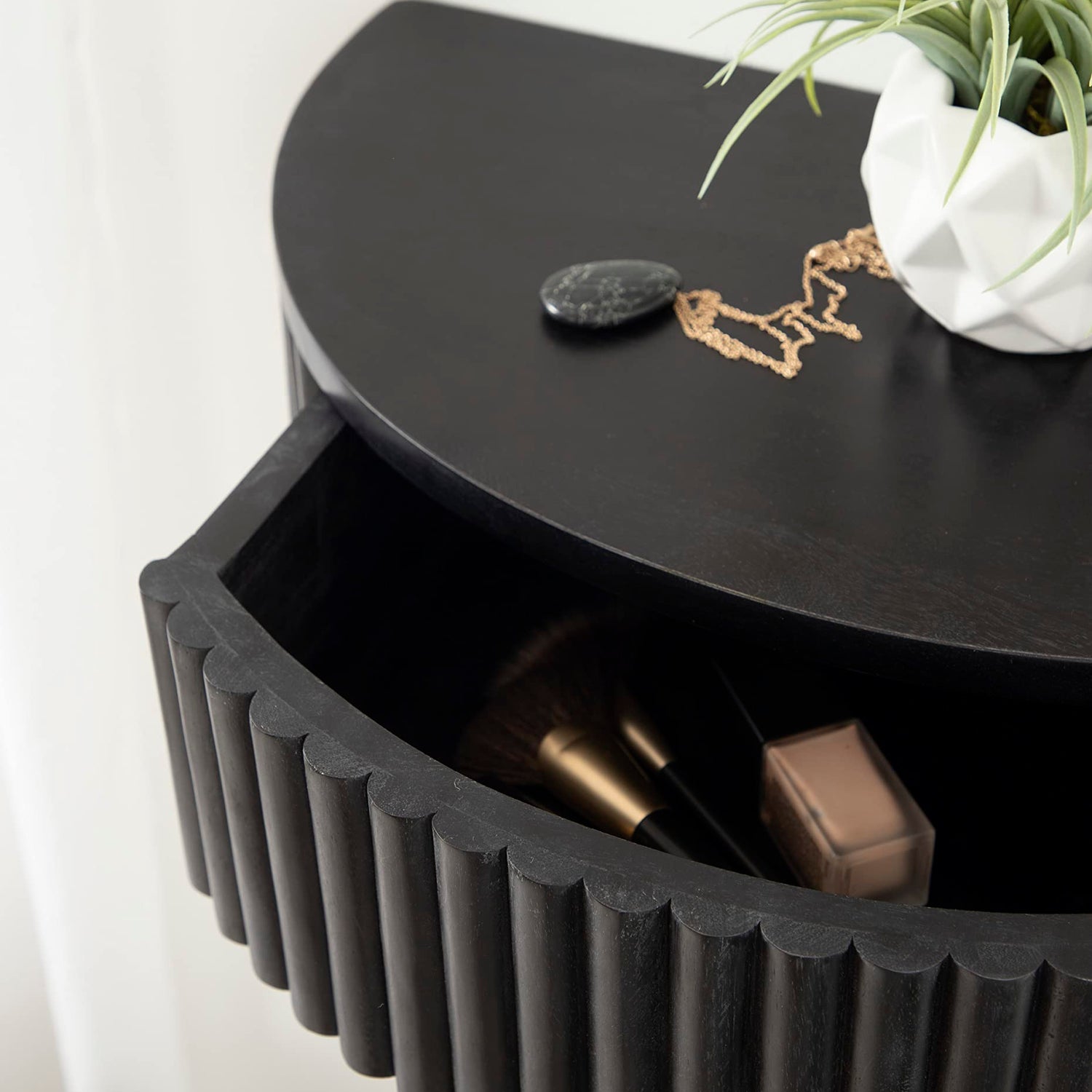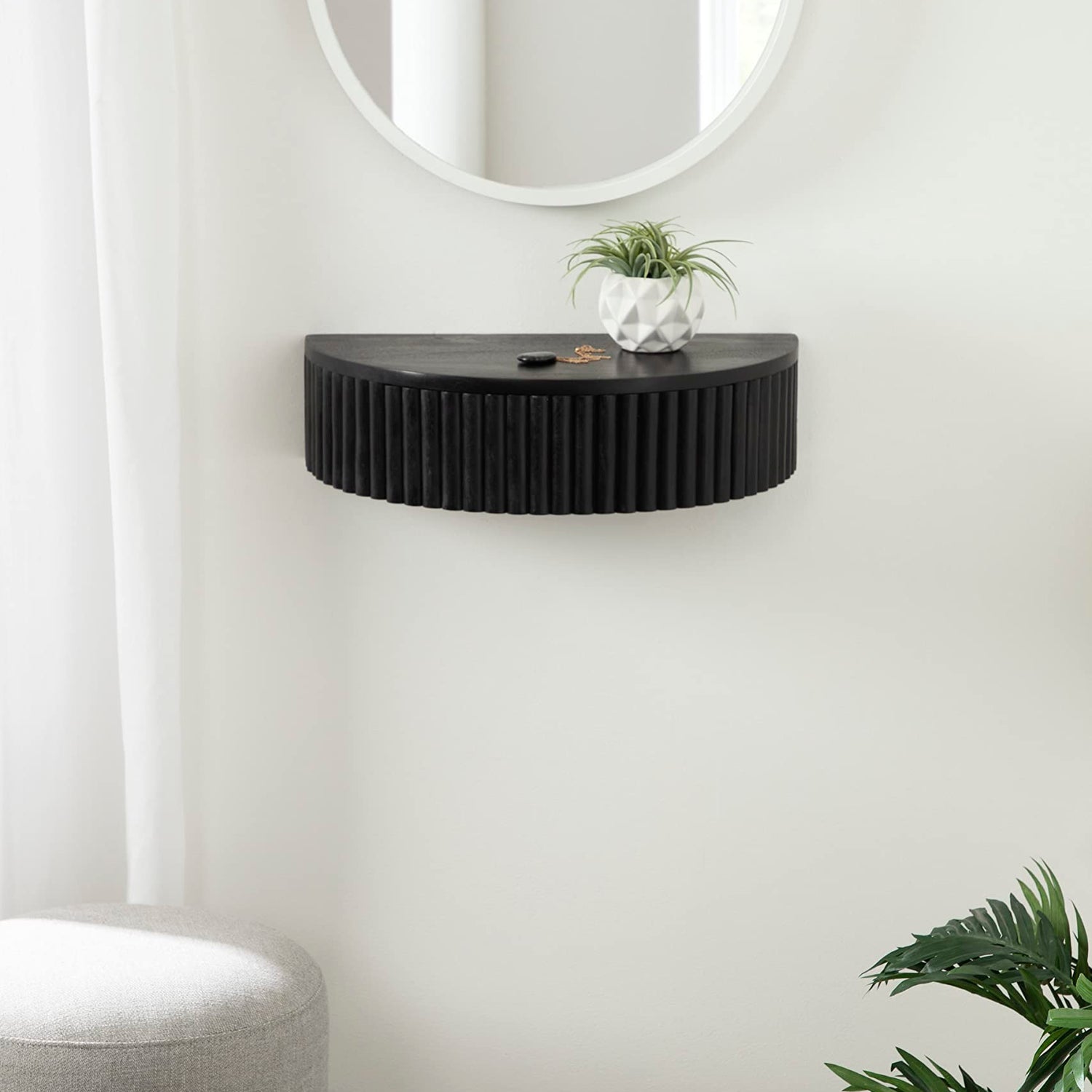 Details: Introducing the Reid ribbed floating side table, a stylish and functional addition to your home decor. This modern wood floating shelf is designed with a ribbed texture, adding a touch of sophistication to any room. The sleek black color of this floating side table adds a contemporary vibe to your space, making it a perfect fit for modern and minimalist interiors. Crafted from solid mango wood, it's built to last and withstand everyday use. The ribbed wooden construction adds a unique and eye-catching element, making it a focal point in any room. One of the standout features of this floating side table is the convenient drawer for extra storage. The drawer offers hidden storage space for keeping small items organized and out of sight, helping you maintain a clutter-free living space. It's perfect for storing remote controls, chargers, pens, or any other small items you want to keep within easy reach but neatly tucked away. The Reid side table is not only functional but also adds a touch of elegance to your home. Whether you use it in your living room, bedroom, or entryway, this floating side table is sure to enhance your home decor and provide extra storage and functionality. Invest in this table today and elevate your home decor to the next level. With its half-circle design, ribbed wooden texture, and a convenient drawer for extra storage, this modern wood floating shelf is a practical and stylish addition to any room. Measuring 20 inches wide by 11 inches deep by 5.5 inches tall, it's the perfect size to fit in small spaces while still providing ample storage and display options. Don't compromise on style or functionality - get your Reid side table now and transform your space into a sophisticated and organized haven.