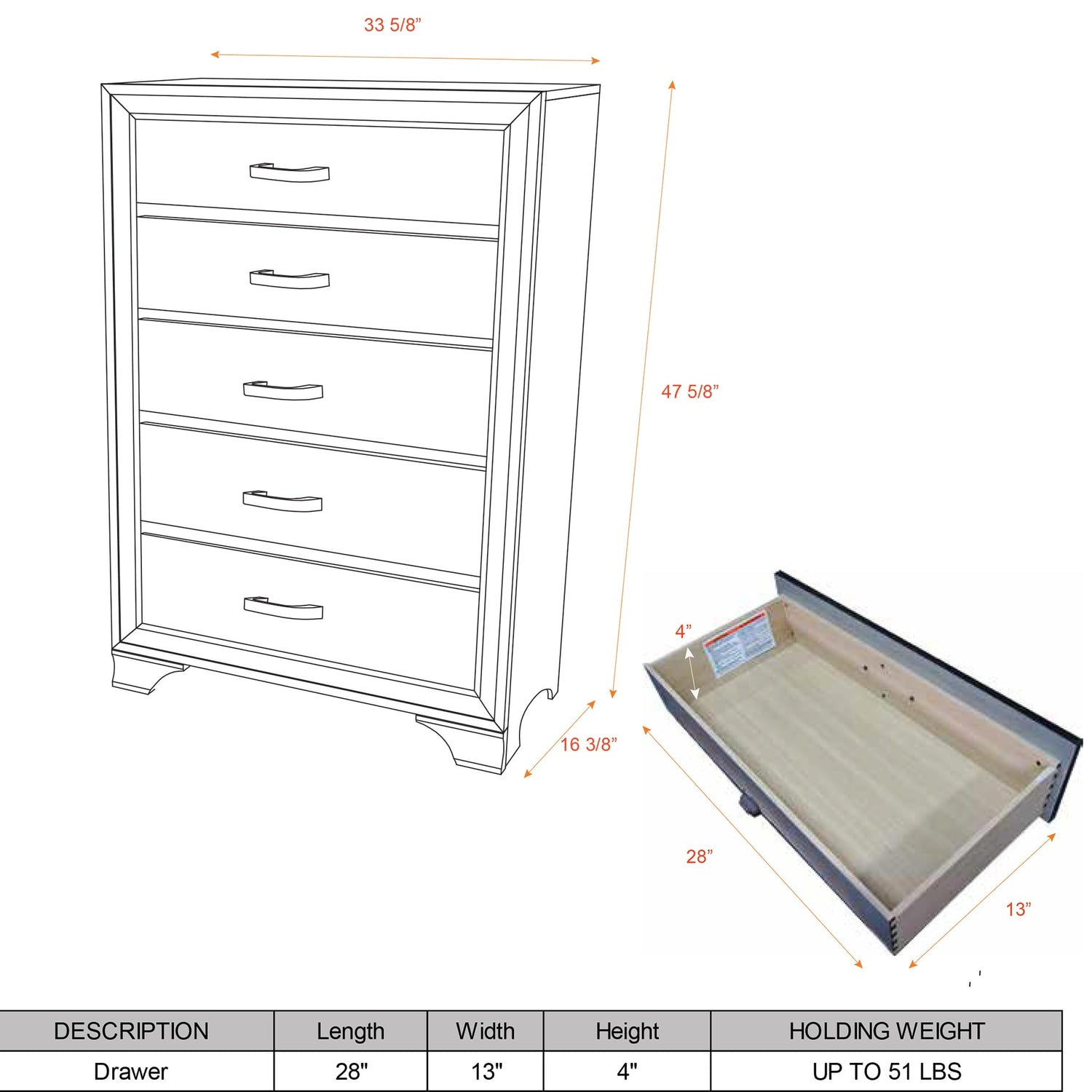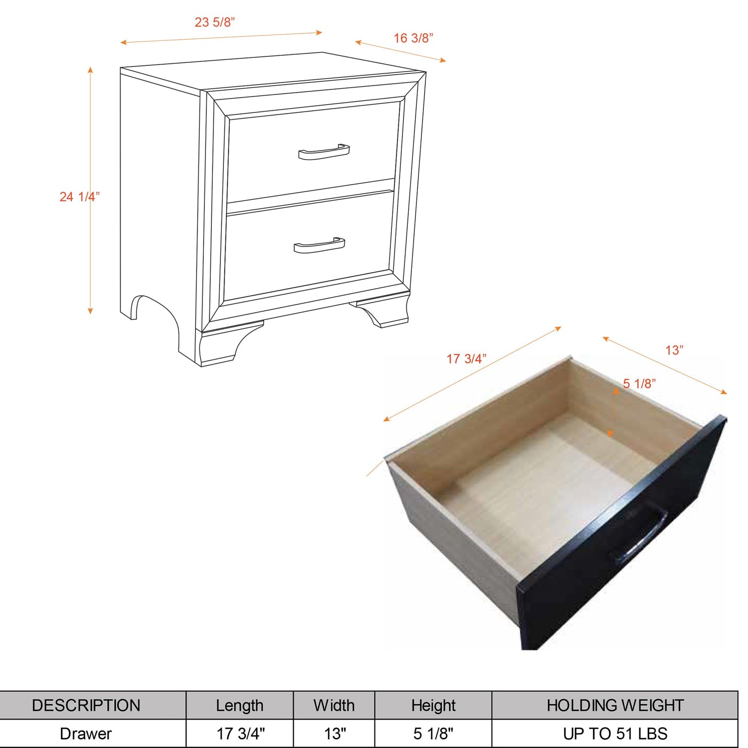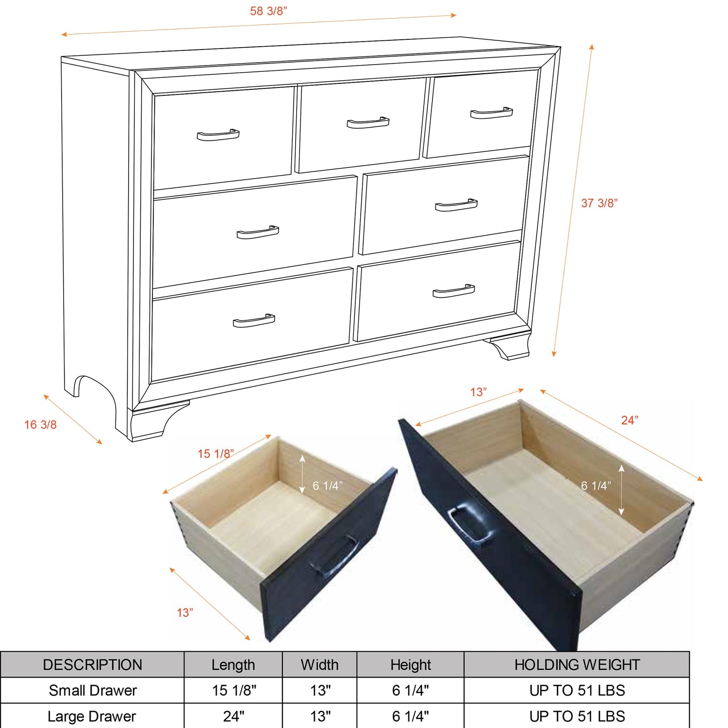Inner Drawer Sizes Dresser: Small: 15"W x 13"D x 6"H - Large: 24"W x 13"D x 6"H Chest: 28"W x 13"D x 4"H Nightstand: 18"W x 13"D x 5"H