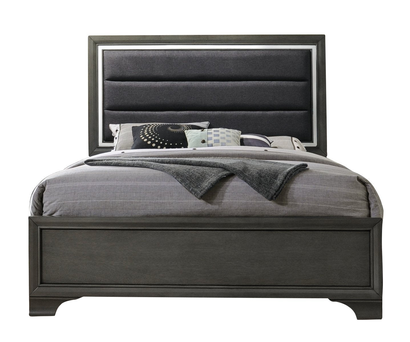 A modern grey finish covers the strong wood construction for simple beauty, while metal inlays in the headboard and casegoods offer smooth sophistication.