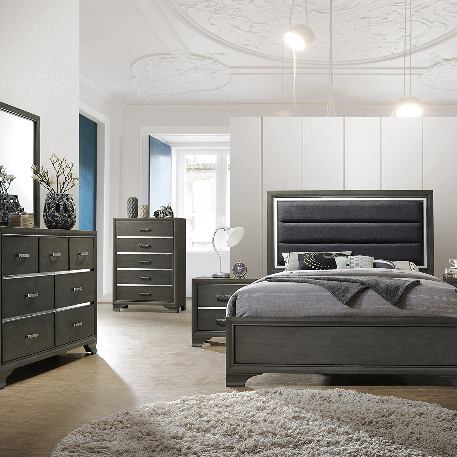 Kings Brand Furniture – 6-Piece Gray Wood with Faux Leather Headboard King Bedroom Set. Bed, Dresser, Mirror, Chest, 2 Night Stands