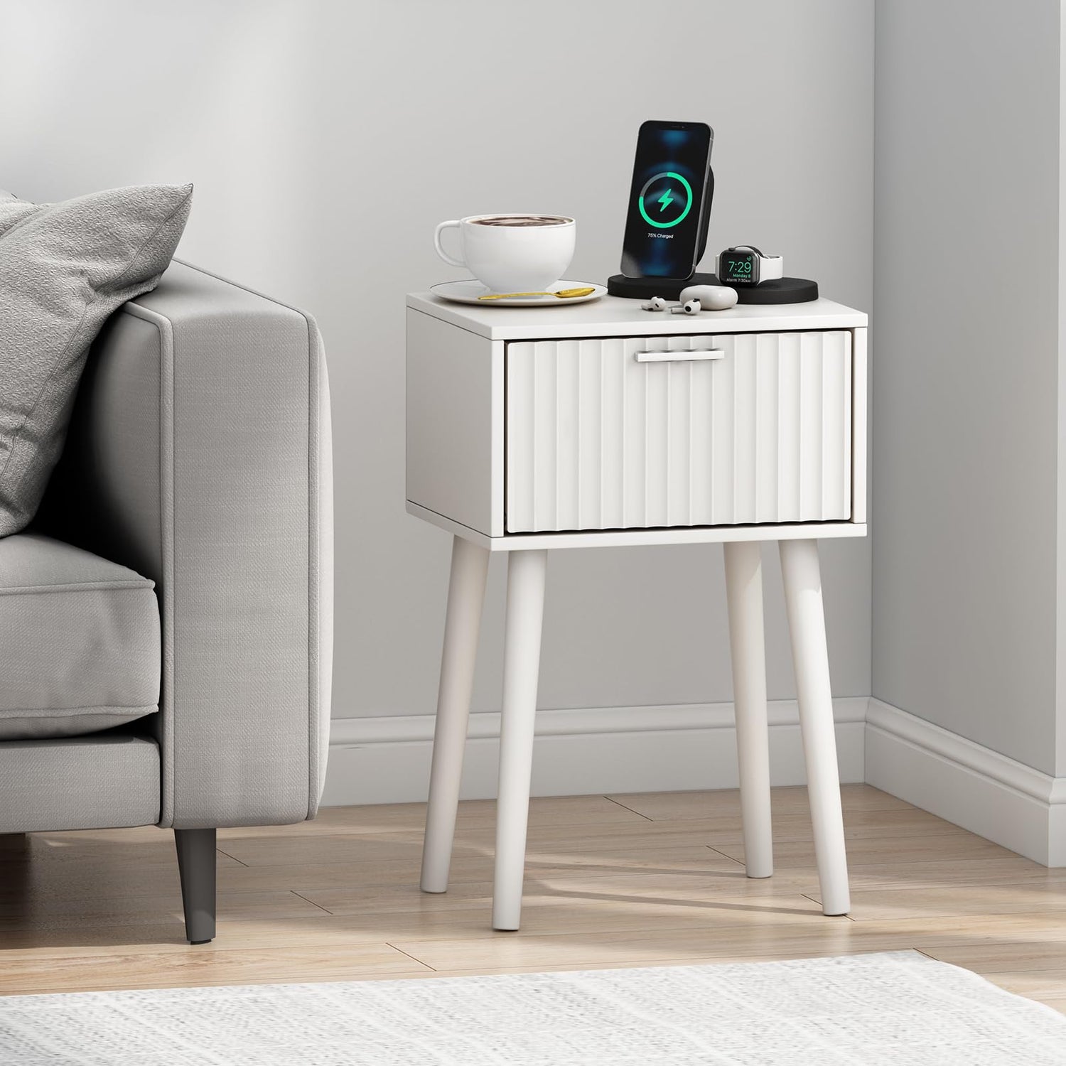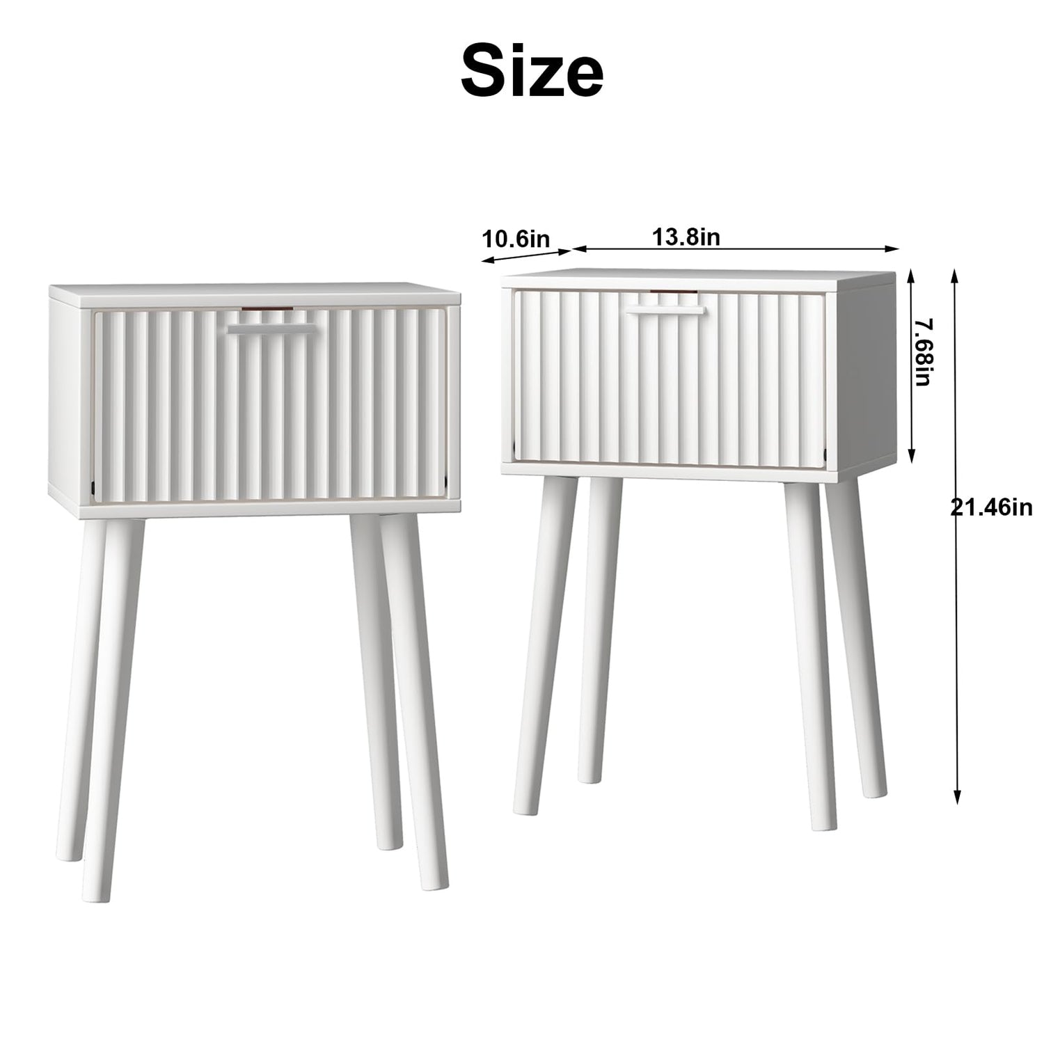 LAATOOREE Nightstands Set of 2, Small Side Table, Bedside Table with Fluted Door, Solid Wood Feet; Modern Mid-Century End Table for Bedroom, Small Space (White)