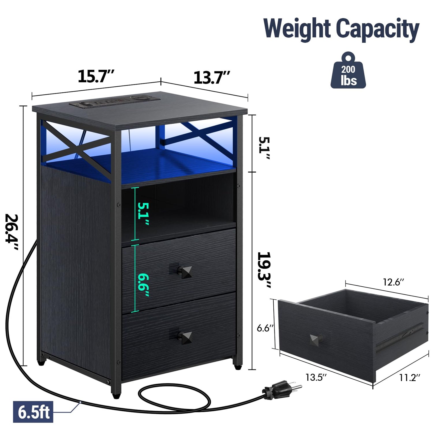 - Nightstand with LED Lights: This bedside table for bedroom comes with color-changing led light strip, giving thousands of colors by app control, 4 rhythm modes and 3 kinds of brightness, which is up to your needs. They’re controlled by infrared remote control or by app.