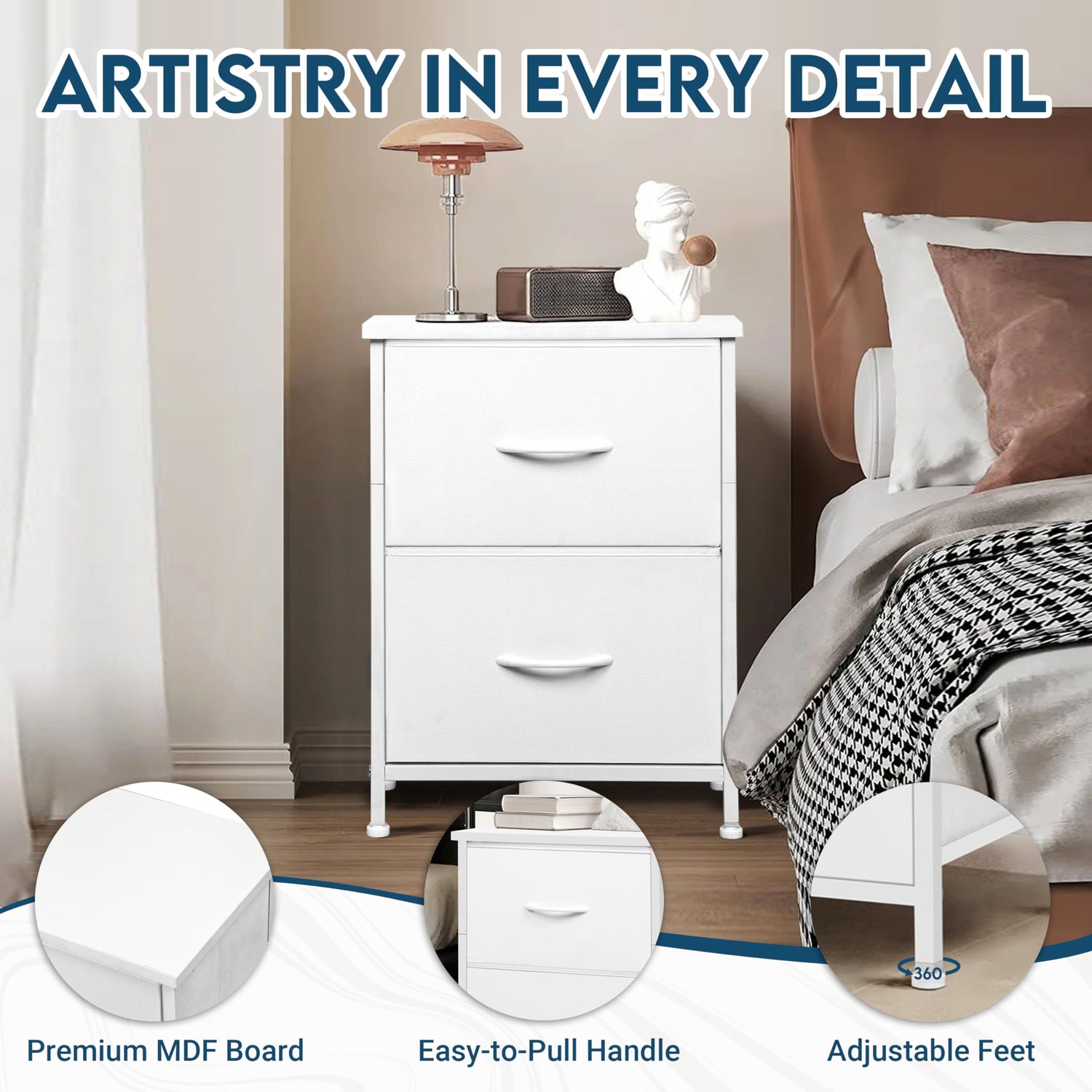 Details: Upgrade your bedroom with this modern white nightstand, the perfect blend of style and functionality. Measuring 15.7"(L) x 11.8"(W) x 21"(H), this compact bedside table fits seamlessly into small spaces like bedrooms, guest rooms, nurseries, and apartments. Featuring two spacious drawers (13.5"(L) x 11"(W) x 8.5"(H)), it provides ample storage for chargers, books, and other essentials, keeping your tabletop clutter-free. Crafted with a sturdy metal frame and premium MDF top, this nightstand is built to last. Adjustable feet ensure stability on any surface. Easy to assemble with included instructions and hardware. Its clean white finish complements any decor, making it an ideal kids nightstand or a stylish addition to any room. Get organized and enhance your space with this versatile and durable white nightstand!