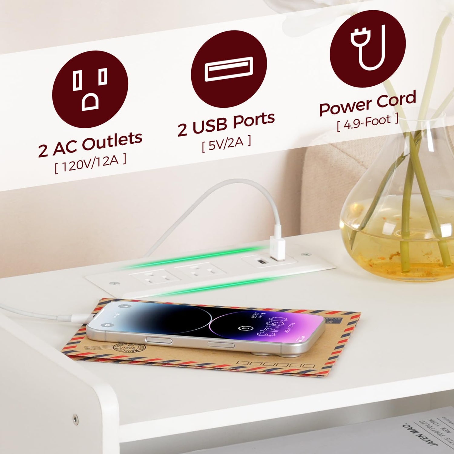 - End Table with Charging Station: This white nightstand features 2 AC outlets and 2 USB Type-A ports, allowing you to charge your phone without leaving the comfort of your bed. And the end table's cable hole design efficiently organizes wires, preventing tangles and clutter