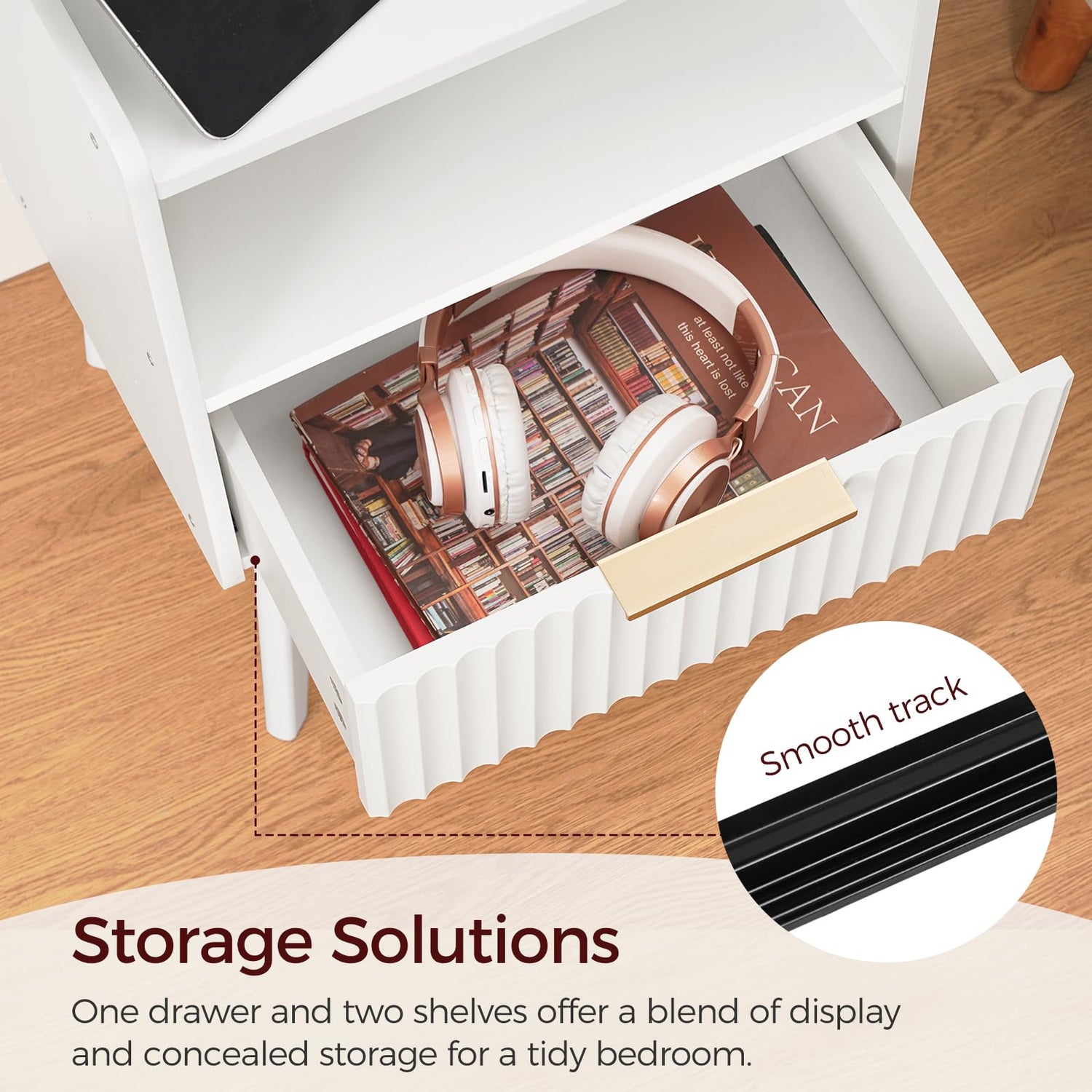 MAHANCRIS End Table Living Room Fluted Night Stand, 15.9" Modern Side Table with Charging Station,Bedside Table with Drawer for Small Spaces, Bedroom, White ETWT61E01