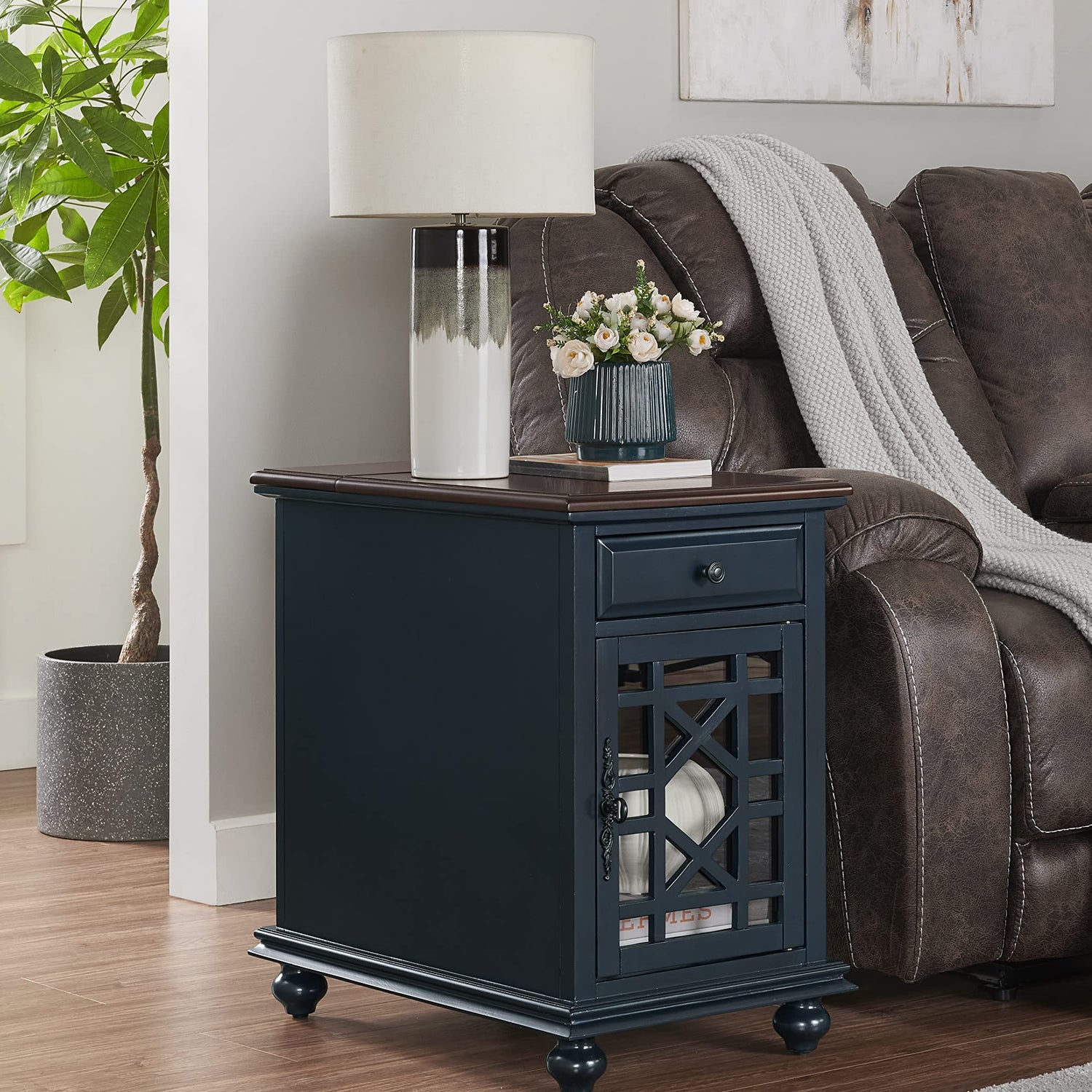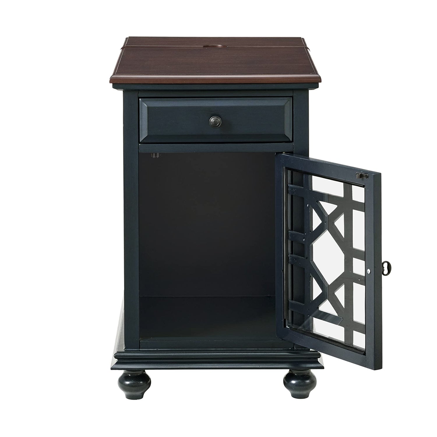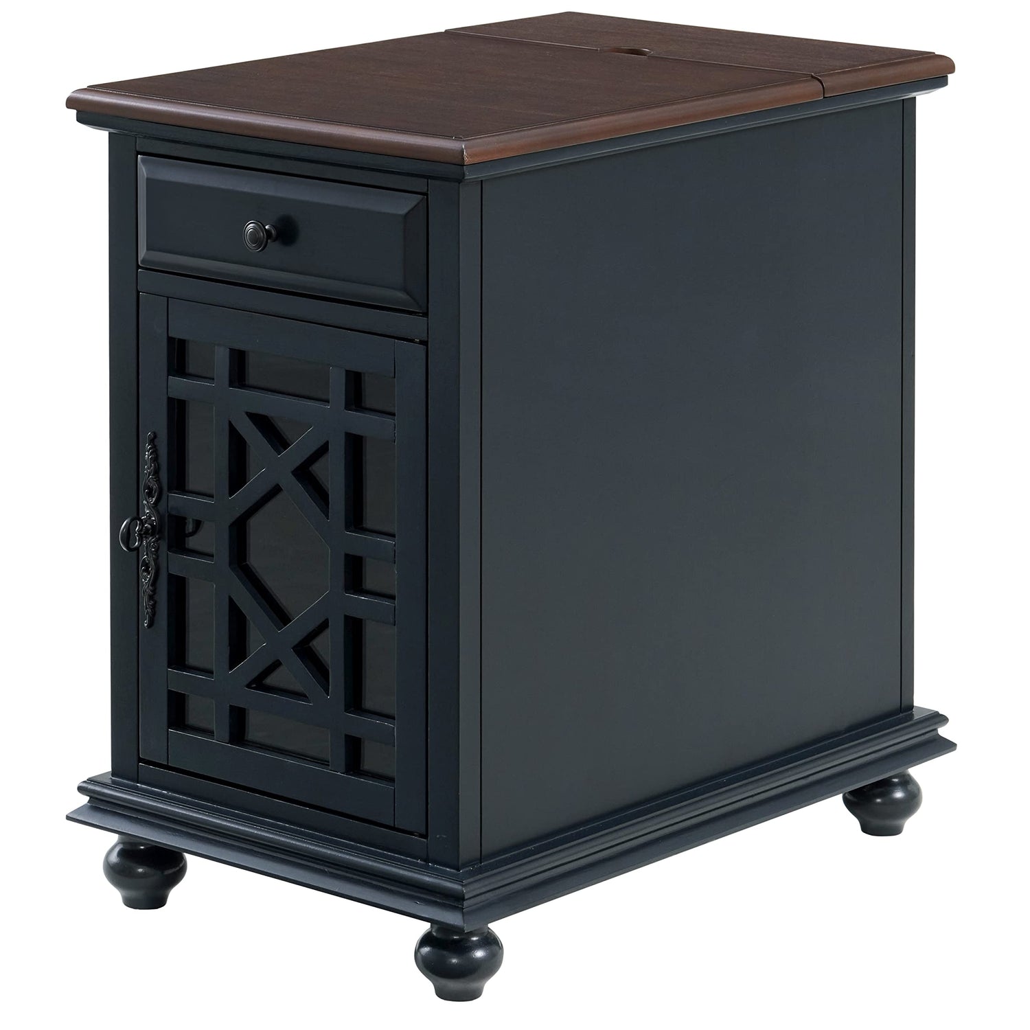 The Elegant Chairside Table with Power features a beautiful painted finish with sophisticated transitional styling inspired by design cues taken from Parisian antique markets. Each piece is slightly distressed with just the right amount of rub through at the edges to make it seem like this was a piece handed down through generations. A flip top cover opens up and reveals a power bank with (2) outlets and (2) USB ports for convenient device charging. One (1) drawer and one (1) cabinet area offer plenty of storage space for books, magazines, and games. A magazine rack is located on the back of the table for extra storage space. The drawer slides out on smooth ball bearing roller guides. The cabinet door features an elegant trellis detail with an intricately cast door pull. Perfect to also be used as a side table, end table, or nightstand. Assembled product dimensions: 16" W x 24" D x 25" H. Approximate Drawer Dimensions: 10" W x 13" D x 2.5" H, Approximate Cabinet Dimensions: 13" W x 15” D x 16.5" H. Product materials: MDF and Pine. Item ships assembled, only need to attach the legs. Made in Vietnam.