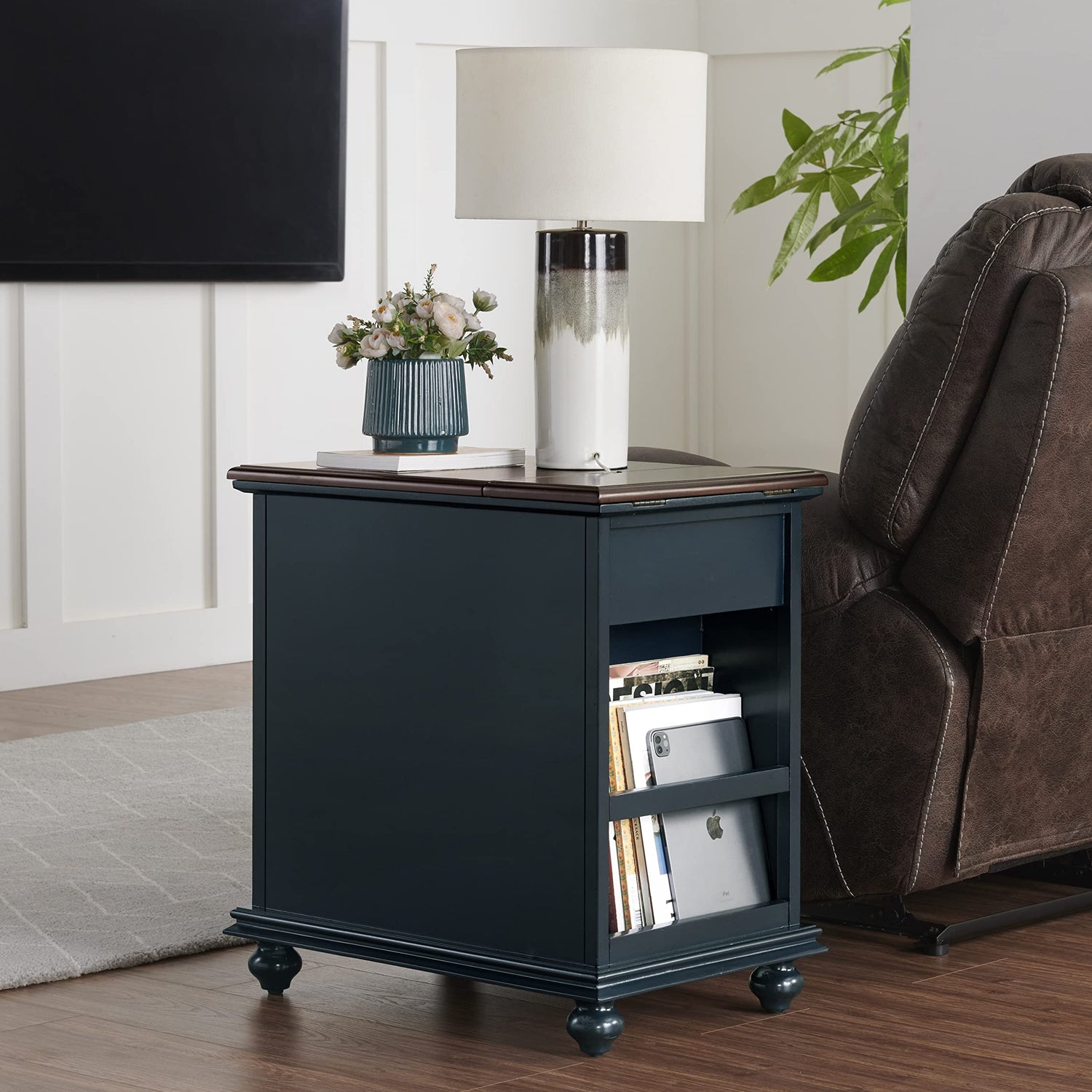 Martin Svensson Home Elegant Power Chairside End Table, 24 in x 16 in x 25 in, Blue with Walnut