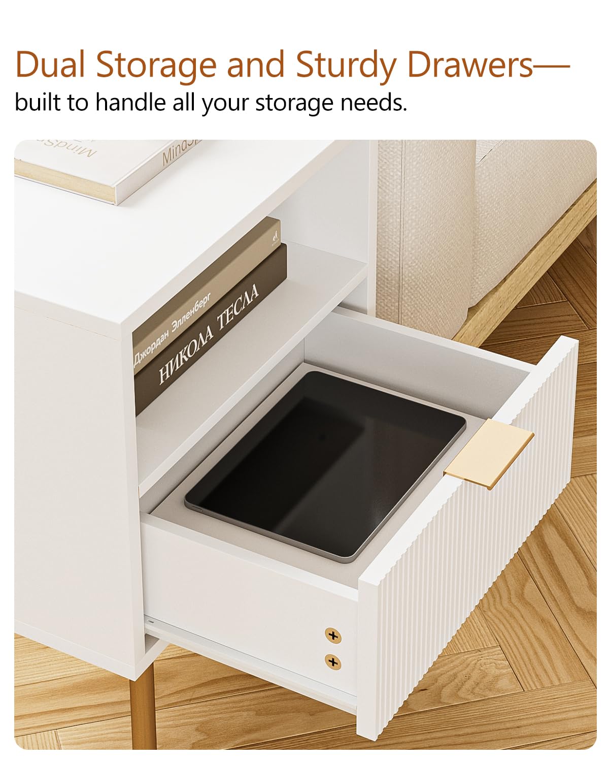 Masupu Nightstand,Mid-Century Modern Bedside Table with Storage Drawer and Open Wood Shelf,Small Gold Frame Side Table for Bedroom,Living Room,White