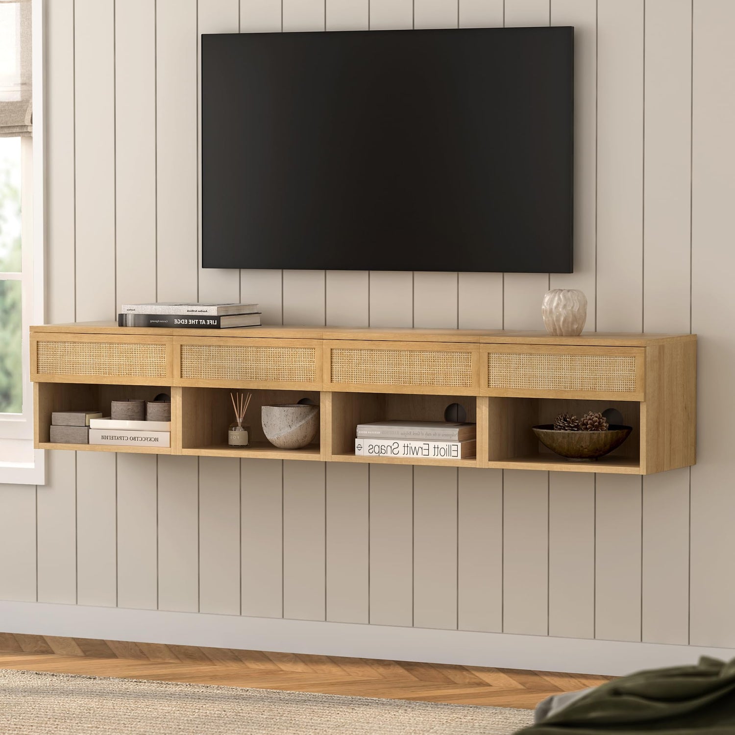 MoomJiee Rattan Floating Nightstands Set of 2, Wall Mounted End Table with Drawer and Open Compartment Modern Wood Bedside Night Stand Storage Cabinet for Bedroom Living Room, Natural Oak