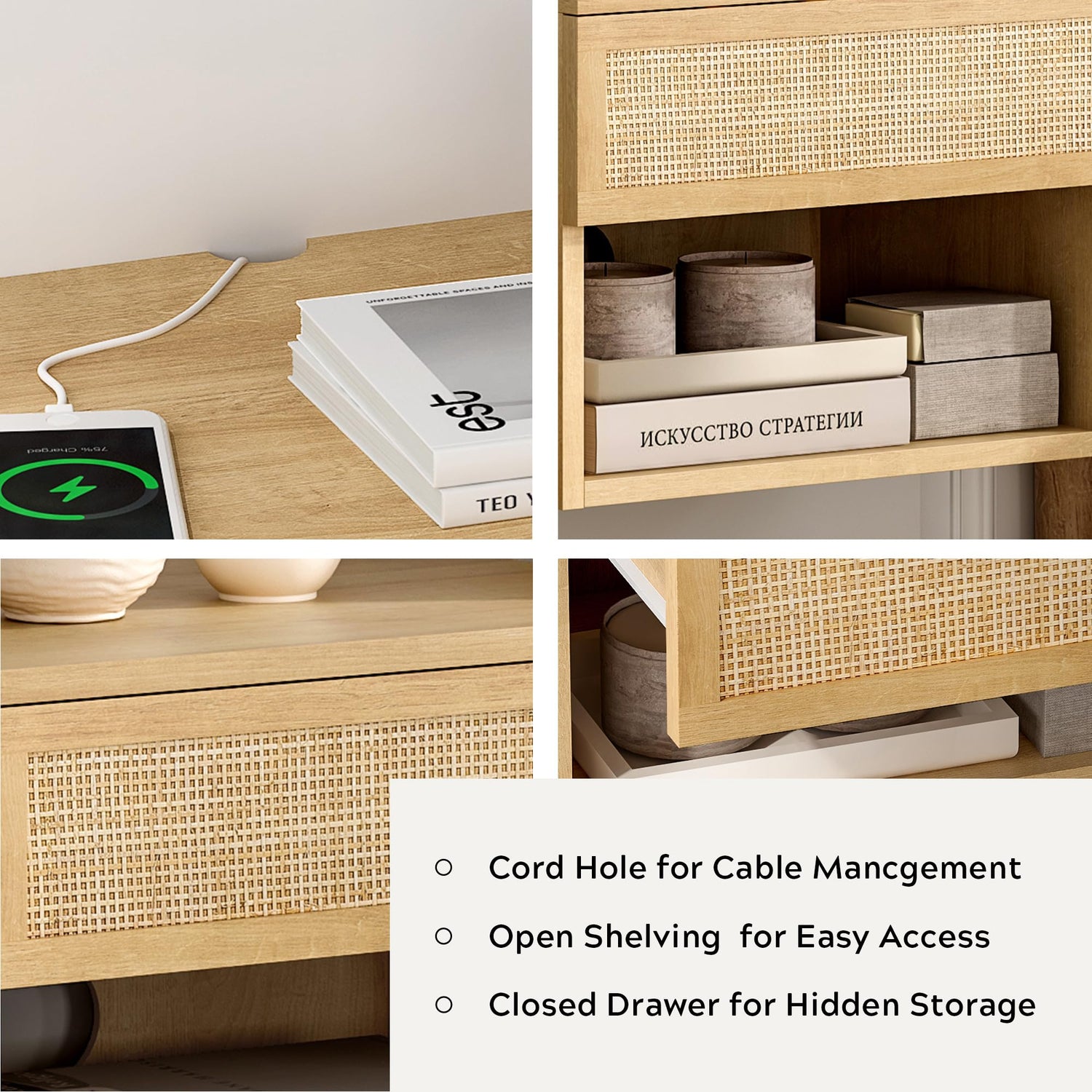 - Stylish Design: The wooden bedside table features a hand-woven design of natural rattan that showcases Art Deco and mid-century modern aesthetics. The drawer and open compartment provide the perfect storage solution for all your bedside essentials