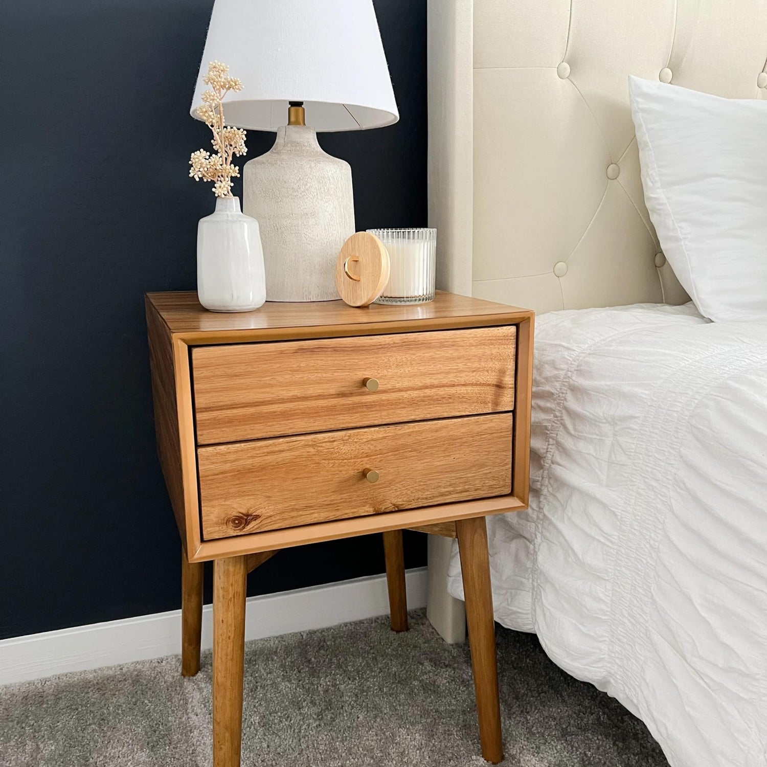 Details: Harper is a mid-century nightstand or small side table that brings modern design to any bedroom or living room space with its slim, tapered pinewood legs and easy-glide drawers for extra storage. This end table will add an elegant touch to your décor with its angled face and vintage brass hardware. Accent this bedside table with a beautiful table lamp, succulent, and coaster while storing your favorite magazines or remotes in the two drawers below.