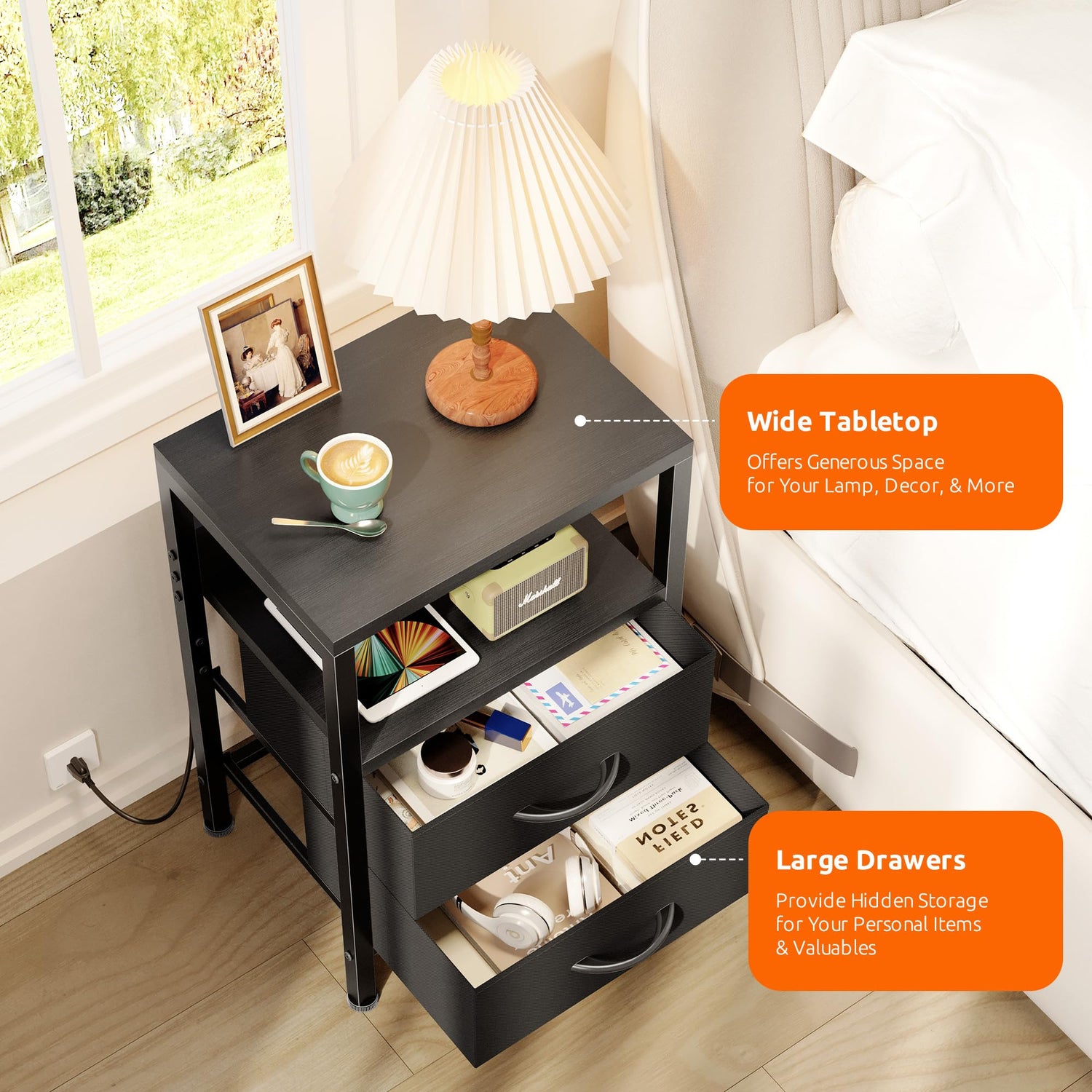 NightStand Bedside Charging Table Bedroom - Night Stand with Charger Station, Modern Nightstand with Open Shelf & 2 Fabric Drawers, Bed Side Table with USB-C USB Ports & AC Outlets for Dorm, Black