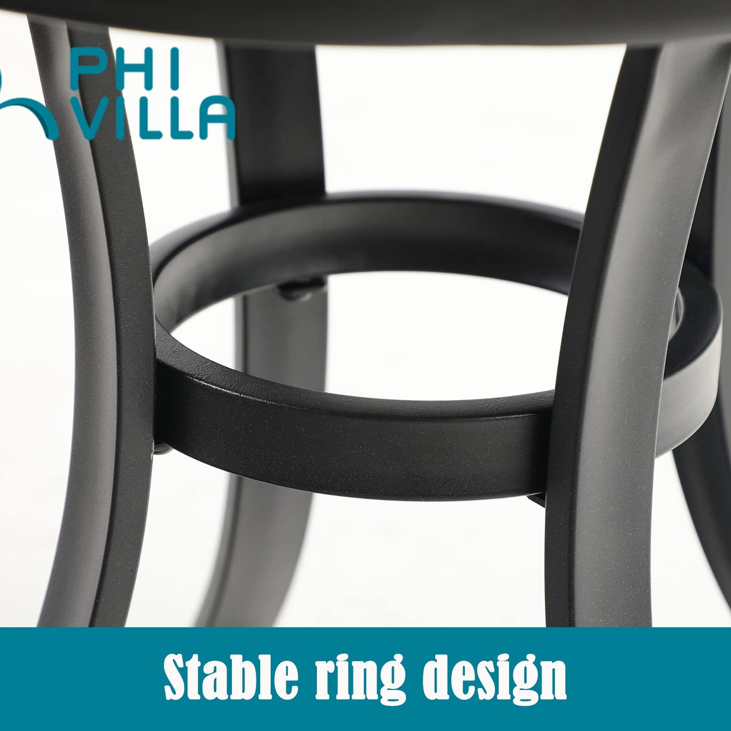 Details: PHI VILLA Patio Round Side Table:The tabletop is designed with imitation wood, and the four curved table legs are fixed by the ring, which is more stable. Metal surface with powder coating is more durable and weather resistant. This chair occupies a small space but provides more value, choose PHI VILLA, add a joy to your courtyard.Specifications: Demension: L19" x W19" x H18.3" Need Assembled: Yes Powder coated metal frame Sturdy and durable, but it is easy to move Occassion: bar, courtyard, outdoor, patio About PHI VILLA: PHI VILLA is a designer's brand and manufacturer which indicates to provide high quality leisure garden furniture in order to meet the continuously expanding market. PHI VILLA produces a specific range of garden furniture which includes chair, patio umbrella, furniture set etc. High quality and fashionable design is PHI VILLA's first goal. PHI VILLA product will provide you with gorgeous beauty of imagination and efforts.