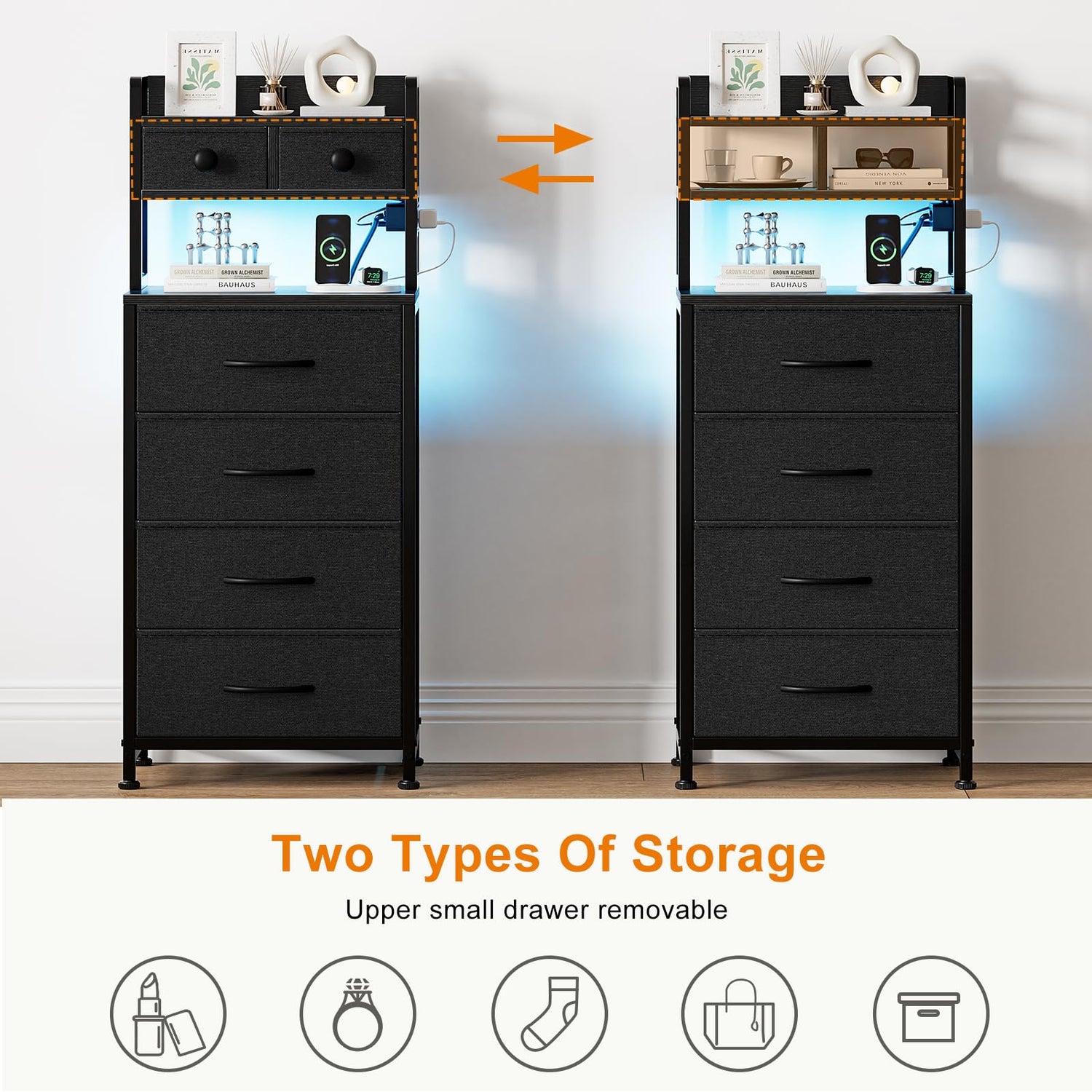 - Tall Night Stand with 6 Fabric Drawers and 3-Tier Wood Storage Shelves; Unique and Space Saving Design: You can place the 2 small drawers above according to your storage needs, forming 2 or 3 storage shelves to effectively utilize vertical space